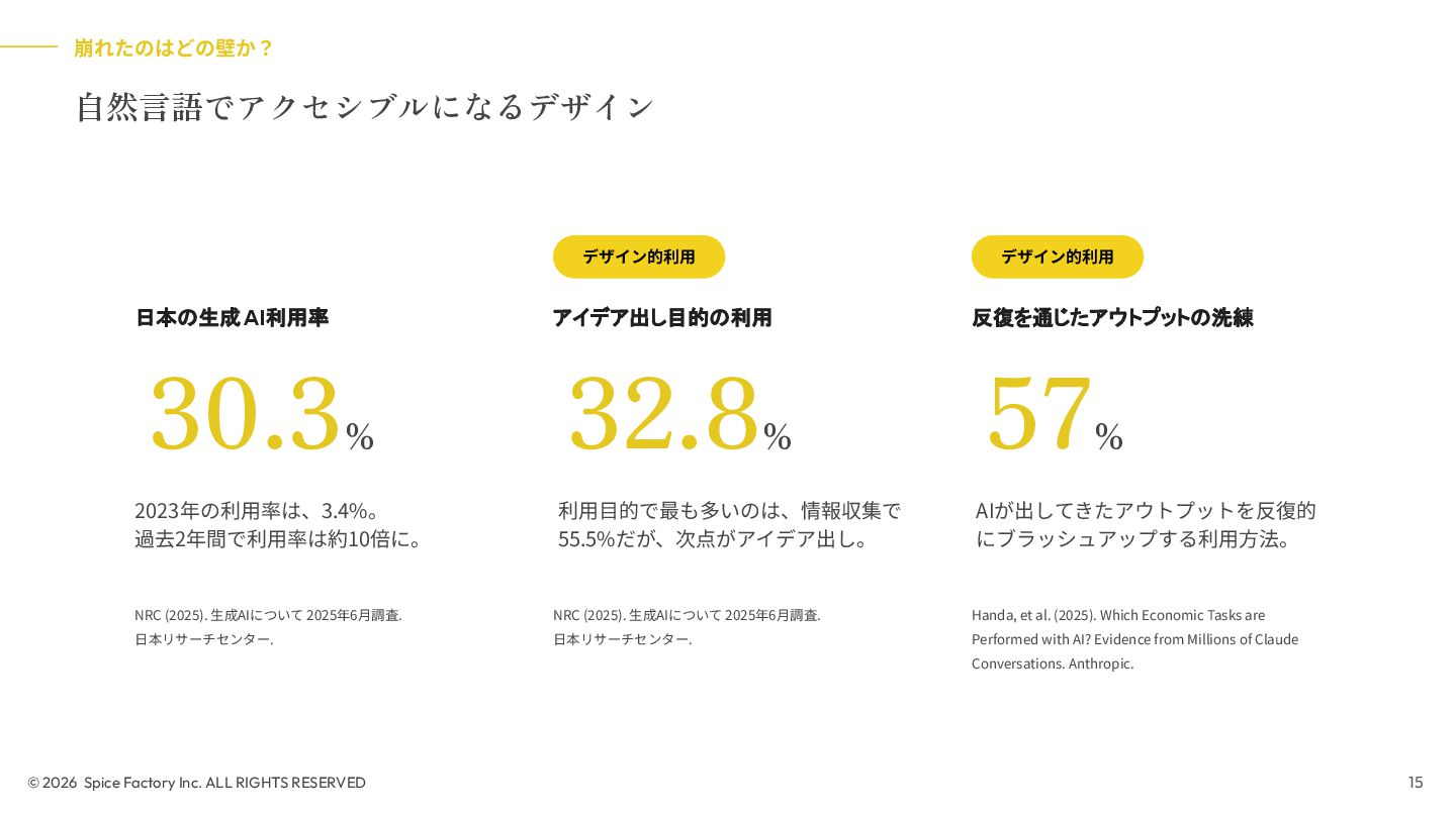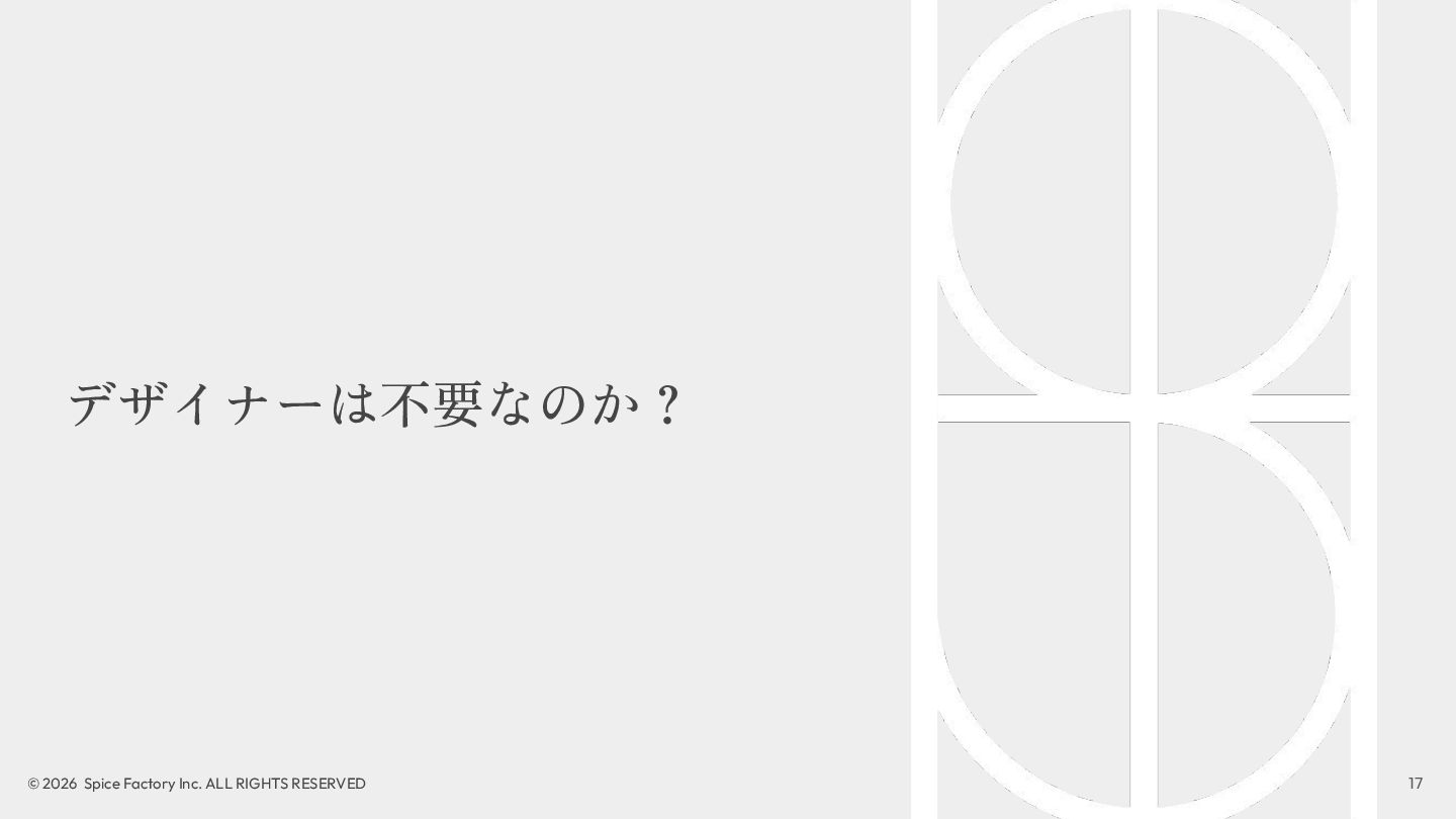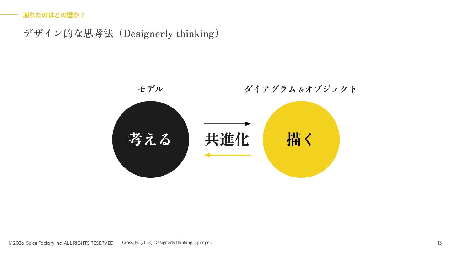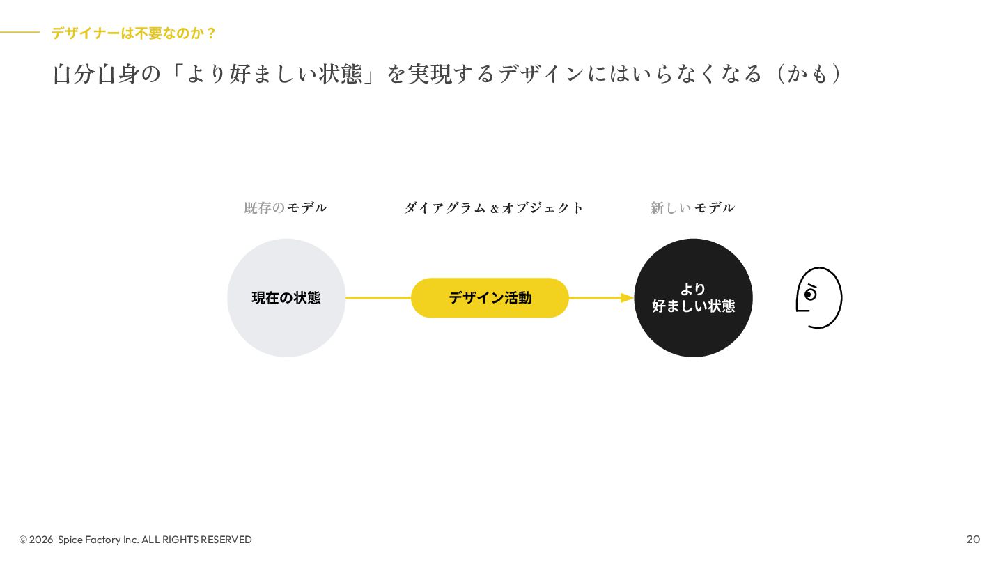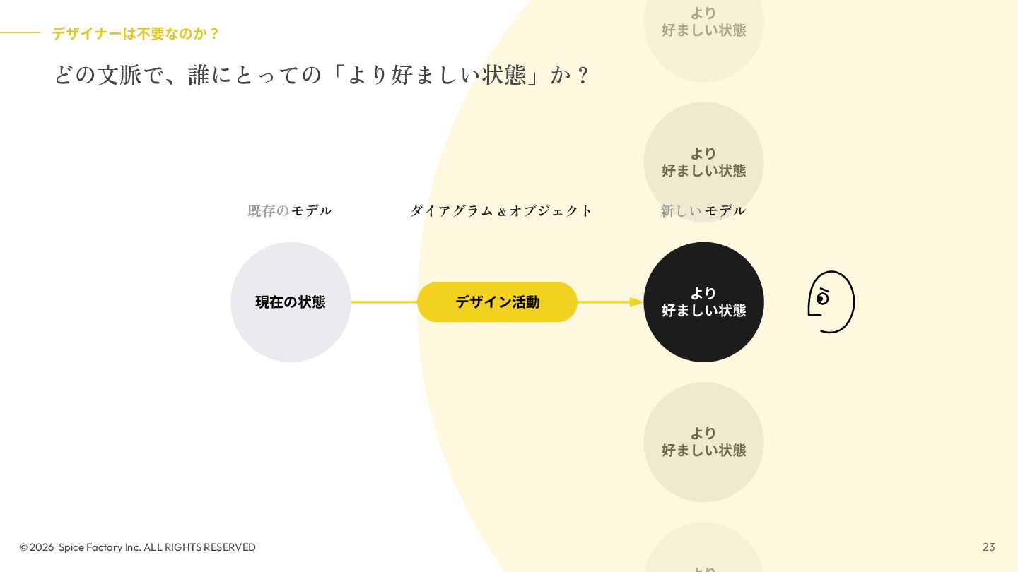 2023年の登壇では、「あらゆる場面でデザインを駆使するための技術」として、デザインを Model/Diagram/Object の連関として捉え直し、専門領域を超えて活用する視座を提示しました。今回の話はその“続編”として、AIが可視化の壁を打ち破る瞬間から始まります。数分でモックが生成される世界で、デザイナーと非デザイナーの間にあったDiagramやObjectを中心とした「可視化」という壁が解体されつつあります。