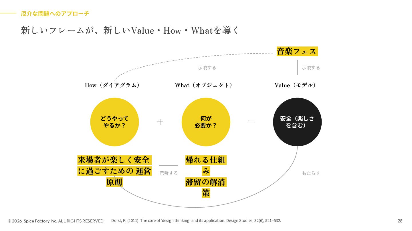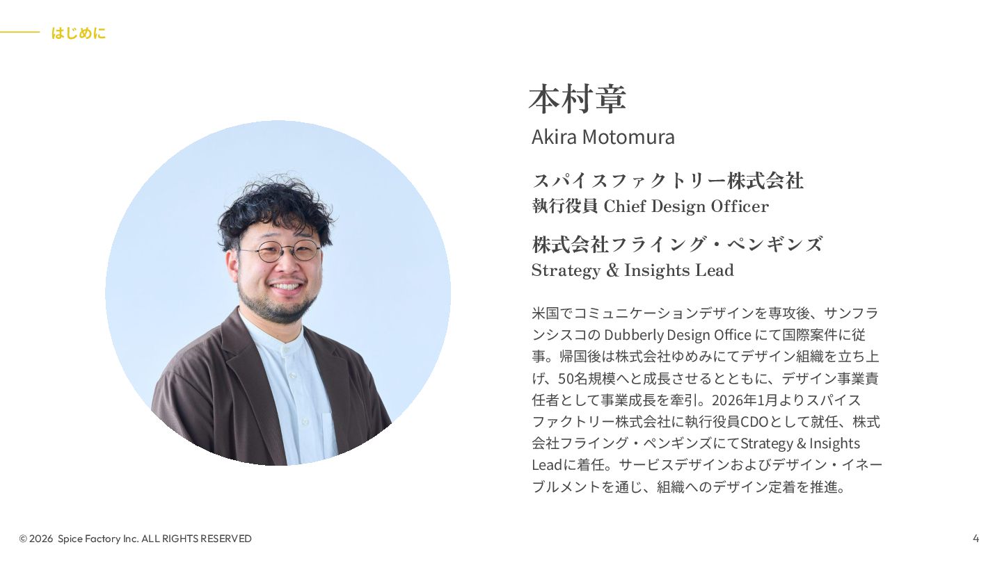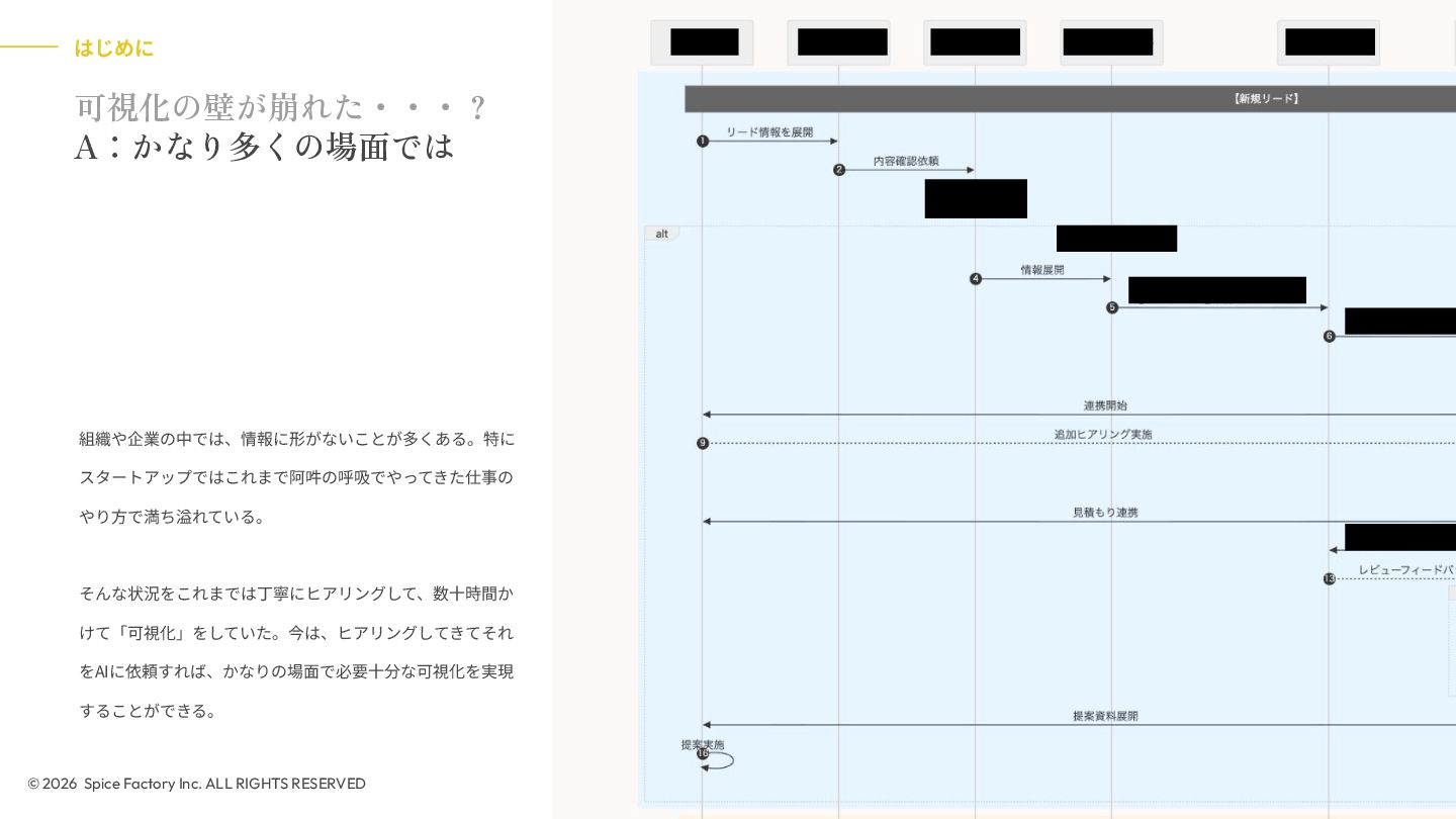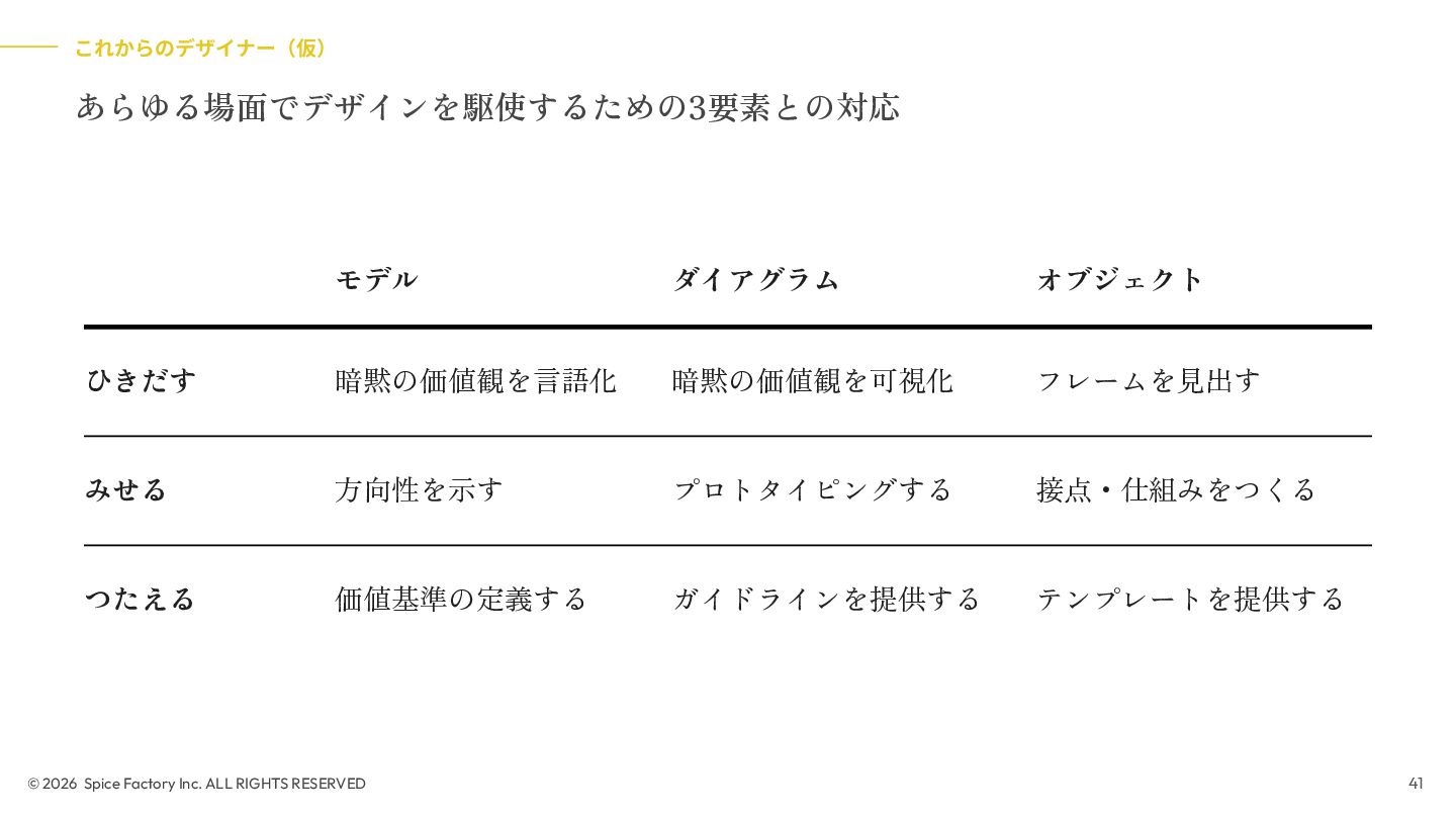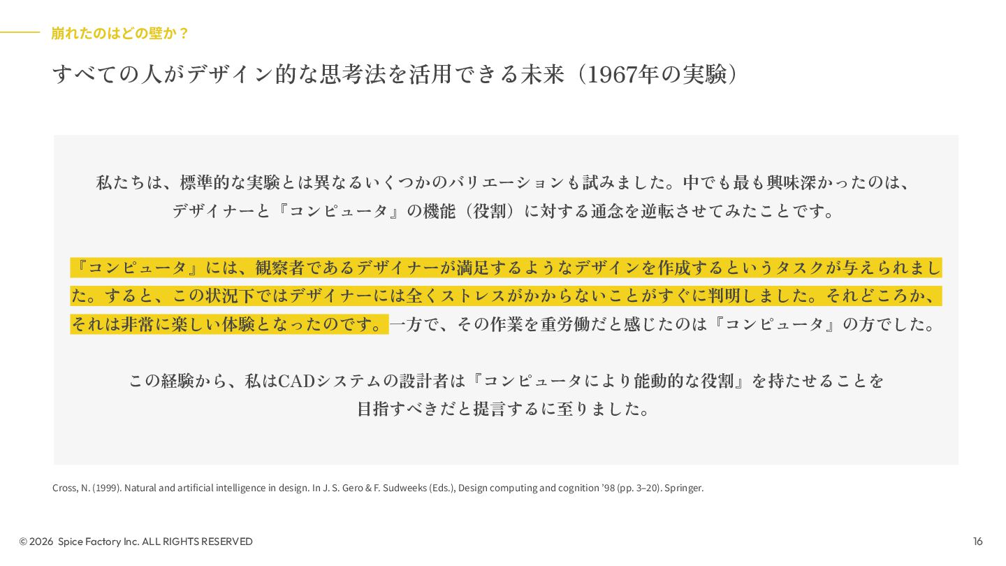 2023年の登壇では、「あらゆる場面でデザインを駆使するための技術」として、デザインを Model/Diagram/Object の連関として捉え直し、専門領域を超えて活用する視座を提示しました。今回の話はその“続編”として、AIが可視化の壁を打ち破る瞬間から始まります。数分でモックが生成される世界で、デザイナーと非デザイナーの間にあったDiagramやObjectを中心とした「可視化」という壁が解体されつつあります。