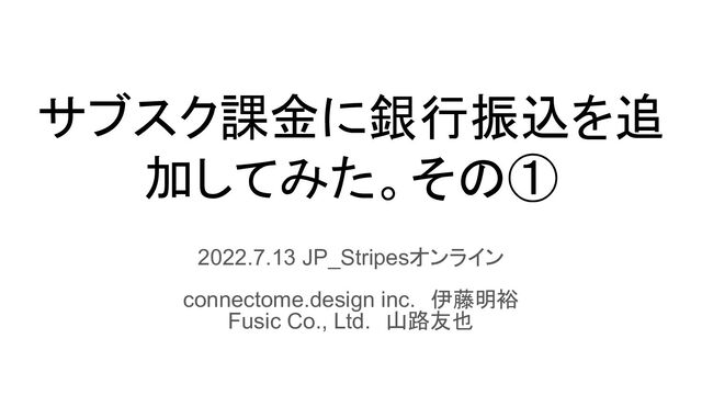サブスク課金に銀行振込を追 加してみた。その① 2022.7.13 JP_Stripesオンライン connectome.design inc. 伊藤明裕 Fusic Co., Ltd. 山路友也