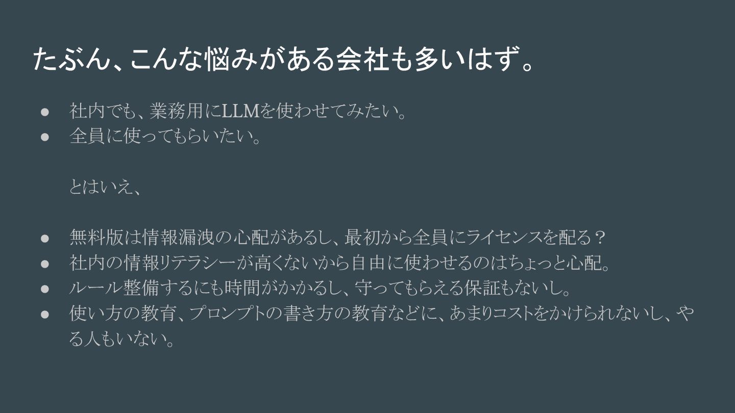 ● 社内でも、業務用にLLMを使わせてみたい。 ● 全員に使ってもらいたい。 とはいえ……。