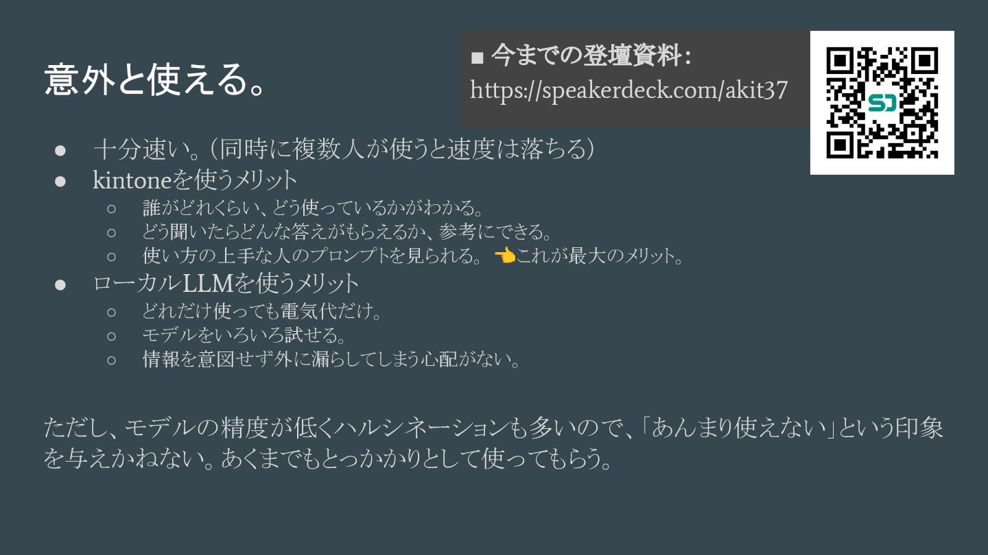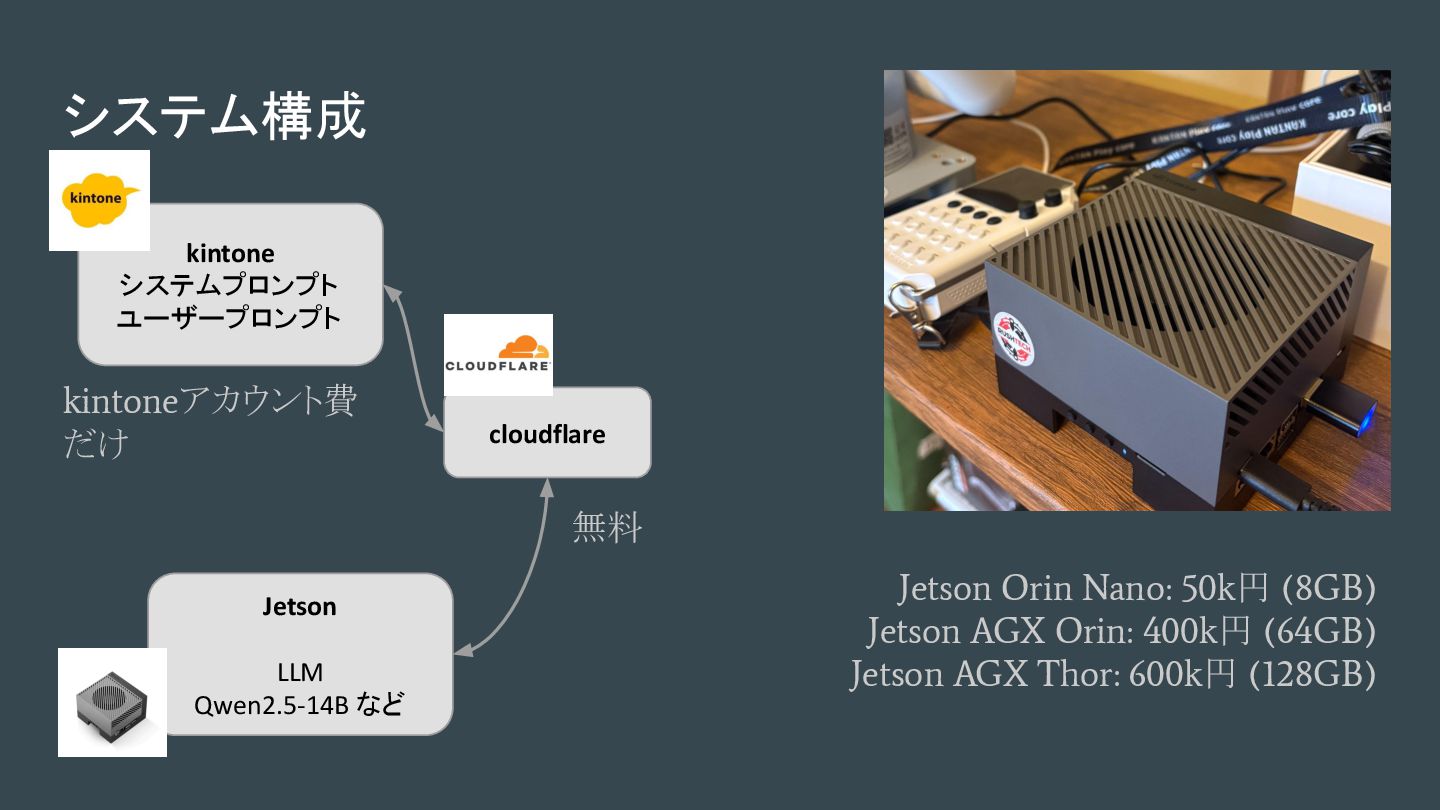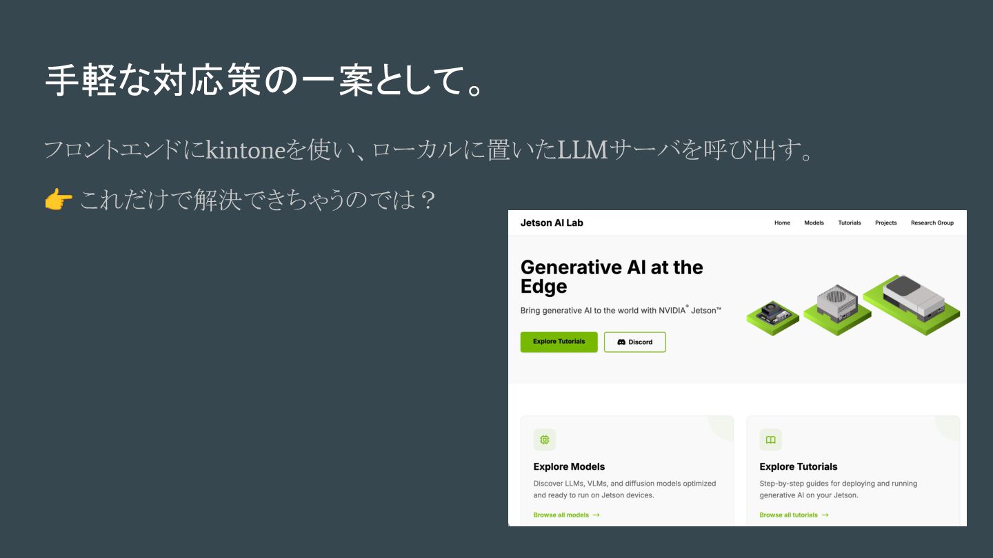フロントエンドにkintoneを使い、ローカルに置いたLLMサーバを呼び出す。 👉 これだけで解決できちゃうのでは?