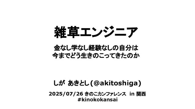 雑草エンジニア しが あきとし(@akitoshiga) 2025/07/26 きのこカンファレンス in 関西 #kinokokansai 金なし学なし経験なしの自分は 今までどう生きのこってきたのか