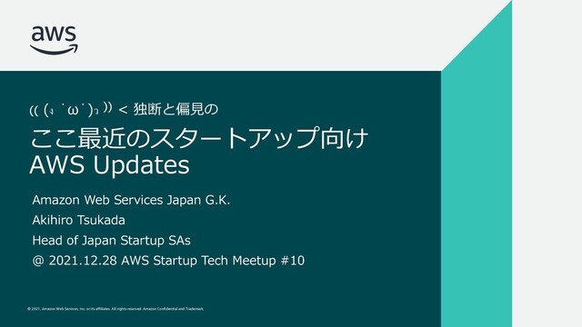 rights reserved. Amazon Confidential and Trademark. コミュニティのみなさまありがとうございます 2 2021 年、AWS Startup Community の存在は 私達 AWS Japan Startup Team が⽇頃接するお客様にとっても、 私達⾃⾝にとっても、⼤きな精神的・実務的な⽀えになっていました。 参加者のみなさま、コミュニティ運営メンバーのみなさま、 本当にありがとうございます。