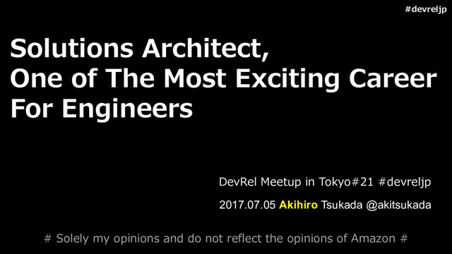 Engineers 2017.07.05 Akihiro Tsukada @akitsukada DevRel Meetup in Tokyo#21 #devreljp # Solely my opinions and do not reflect the opinions of Amazon #
