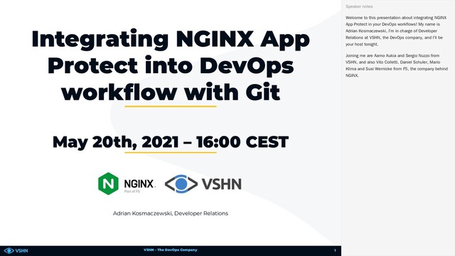 The NGINX App Protect web application firewall (WAF) provides protection for web applications. As the applications are developed using DevOps processes also the setup, configuration and ongoing management of the WAF should be integrated into DevOps and GitOps processes. This talk will explain how we use GitOps to configure WAF rules using NGINX using our open source template that you can use yourself.