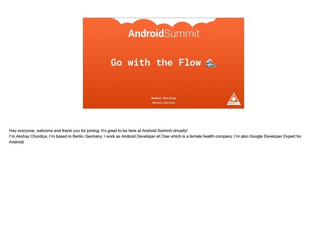 and thank you for joining. It’s great to be here at Android Summit virtually! I’m Akshay Chordiya, I’m based in Berlin, Germany. I work as Android Developer at Clue which is a female health company. I’m also Google Developer Expert for Android.
