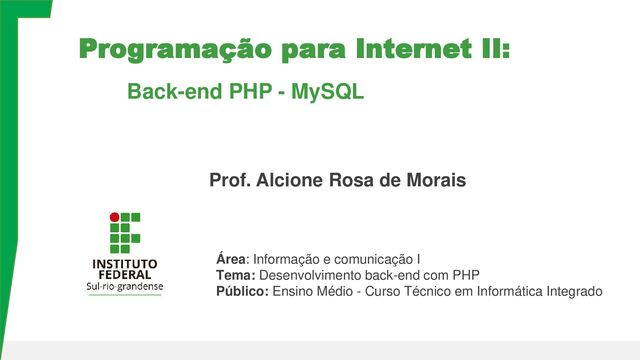 PHP e MySQL Área: Informação e comunicação I Tema: Desenvolvimento back-end com PHP Público: Ensino Médio - Curso Técnico em Informática Integrado
