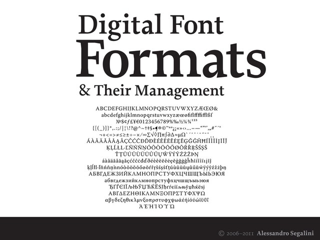 The content was originally written un 2005, and published in Graphicus 1015, at the time the leading Italian magazine for the graphic industry, and consequently designed as a lecture (https://vimeo.com/464552790), a 2006 presentation on digital typography at IUAV Venice, Italy (http://www.iuav.it/). The slides were then updated in 2011 for teaching purposes. The OpenType variable technology should be part of the next update, together with grammatography.