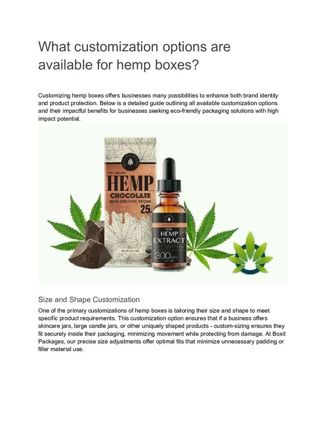 boxes offers businesses many possibilities to enhance both brand identity and product protection. Below is a detailed guide outlining all available customization options and their impactful benefits for businesses seeking eco-friendly packaging solutions with high impact potential. Size and Shape Customization One of the primary customizations of hemp boxes is tailoring their size and shape to meet specific product requirements. This customization option ensures that if a business offers skincare jars, large candle jars, or other uniquely shaped products - custom-sizing ensures they fit securely inside their packaging, minimizing movement while protecting from damage. At Boxit Packages, our precise size adjustments offer optimal fits that minimize unnecessary padding or filler material use.