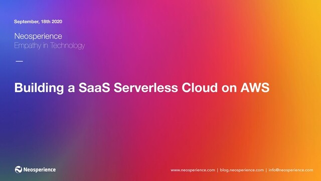 domain ✓a dozen of support services (monitoring, maintenance, OAuth2, Organization, multi-tenancy, etc.) Serverless ✓100% Serverless except for ML model training Lambda Functions ✓200+ functions AWS Resources ✓400+ AWS resources ✓managed through a 15+ CloudFormation stacks Adopting microservices can really make our life as ISV better, with a number of benefits Neosperience is a 100% Serverless cloud solution Time to market ✓improved from months to weeks ✓business features released every sprint ✓technical features released multiple times a week Costs ✓reduced by an order of magnitude Team ✓developers provision cloud resources ✓innovation in encouraged, failure impact is bounded ✓shifted from running after business requirements to waiting for business requirements Happiness Dev Team has full control on delivery Business Team has feature delivery