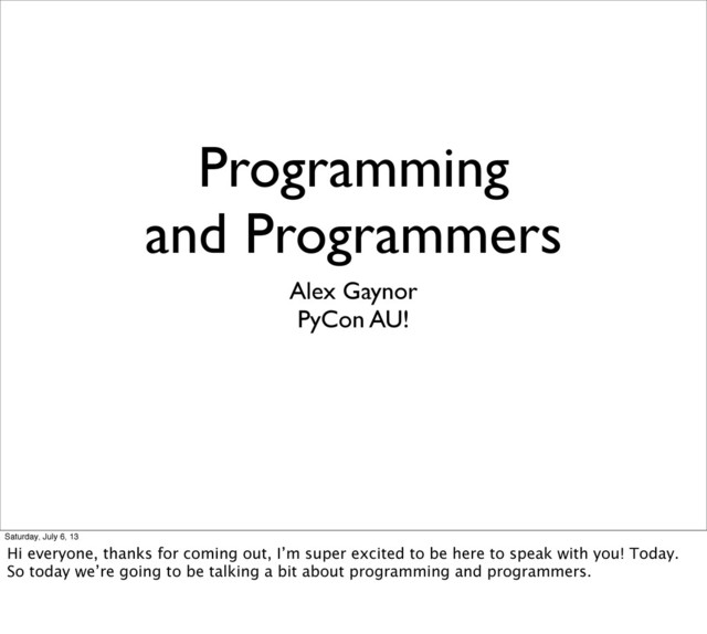 13 Hi everyone, thanks for coming out, I’m super excited to be here to speak with you! Today. So today we’re going to be talking a bit about programming and programmers.