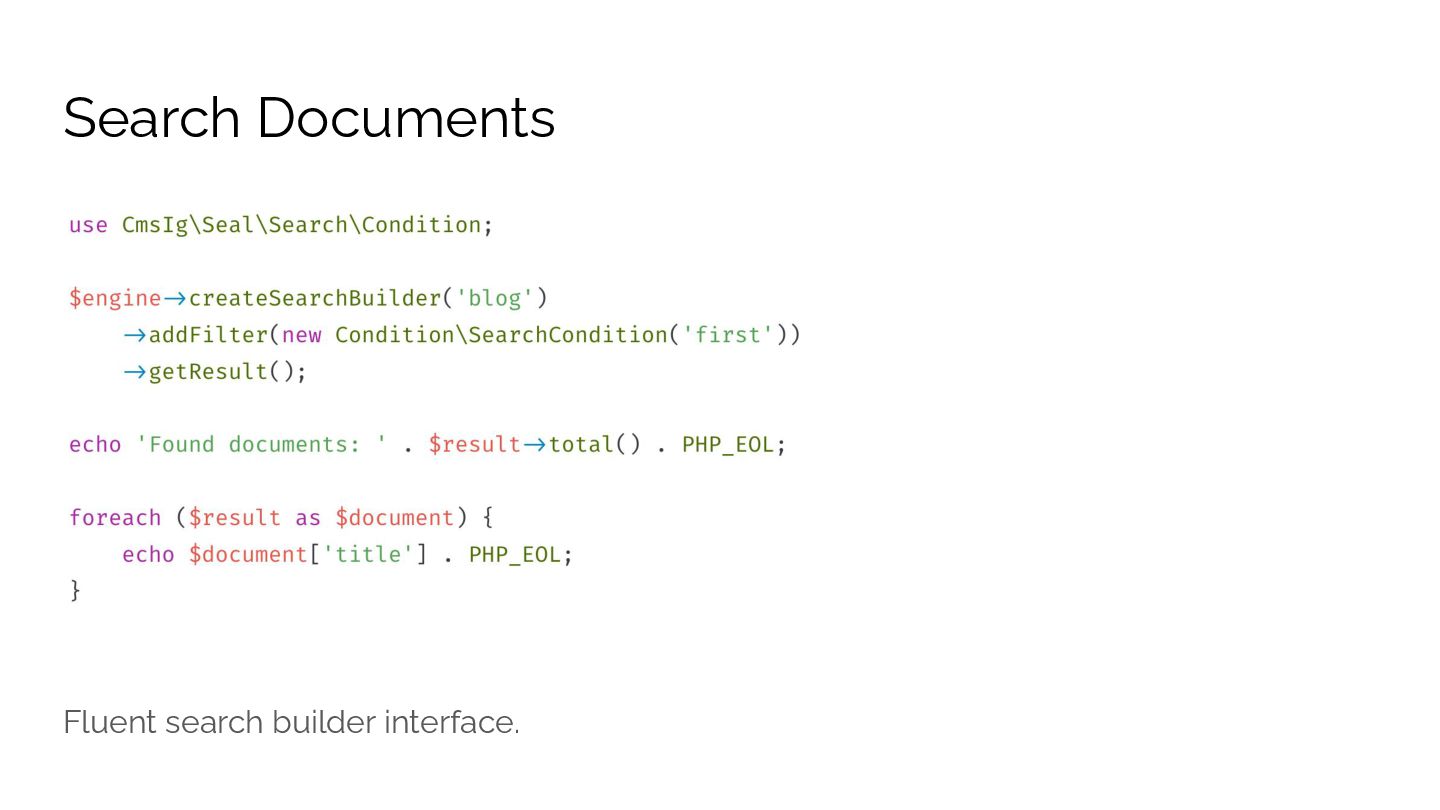 integration into different Frameworks • Easy to tryout other Search Engines or change for different usages • Strict Schema • Backed by the PHP CMS-IG (Contao, Sulu, Typo3) • No rewrites for basics (reindex, add, update, remove documents) Hint: Use what you need, for special queries you still can use the client of your search engine. Add, Remove, Reindex can do SEAL, So if search engine need to be changed only your special query need be migrated.