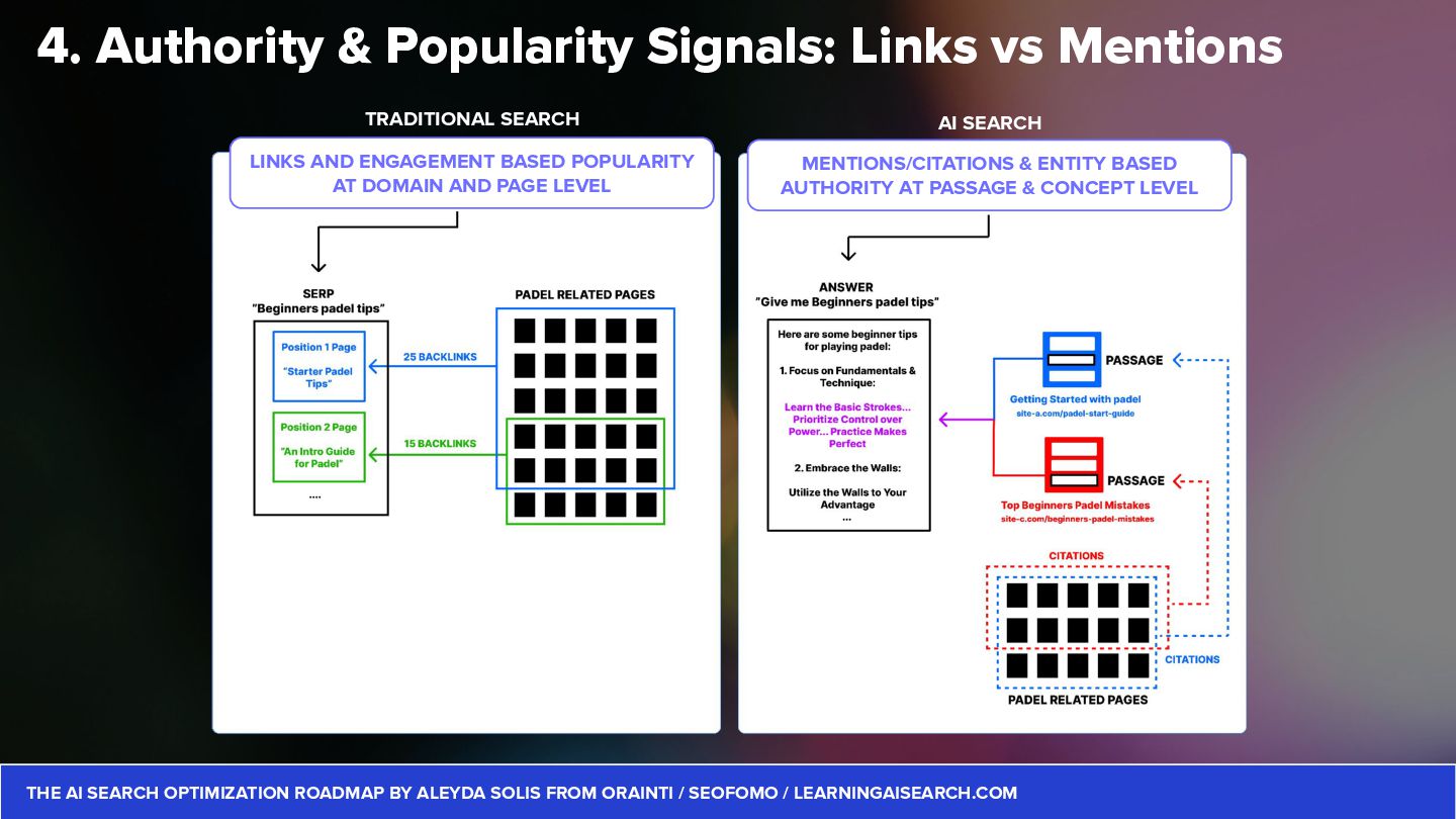 / SEOFOMO / LEARNINGAISEARCH.COM 4. Authority & Popularity Signals: Links vs Mentions LINKS AND ENGAGEMENT BASED POPULARITY AT DOMAIN AND PAGE LEVEL TRADITIONAL SEARCH MENTIONS/CITATIONS & ENTITY BASED AUTHORITY AT PASSAGE & CONCEPT LEVEL AI SEARCH
