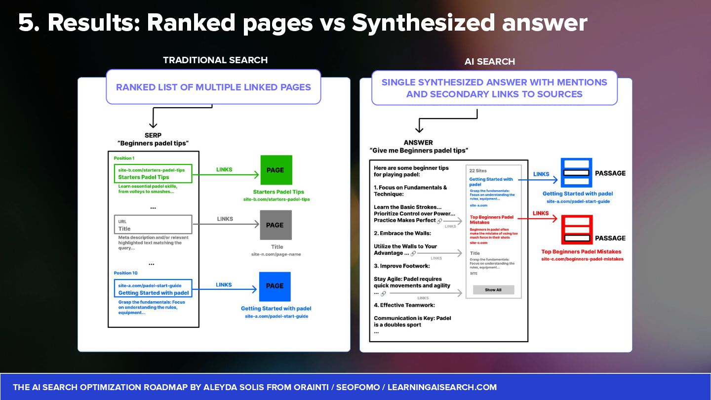 / SEOFOMO / LEARNINGAISEARCH.COM 5. Results: Ranked pages vs Synthesized answer RANKED LIST OF MULTIPLE LINKED PAGES TRADITIONAL SEARCH SINGLE SYNTHESIZED ANSWER WITH MENTIONS AND SECONDARY LINKS TO SOURCES AI SEARCH