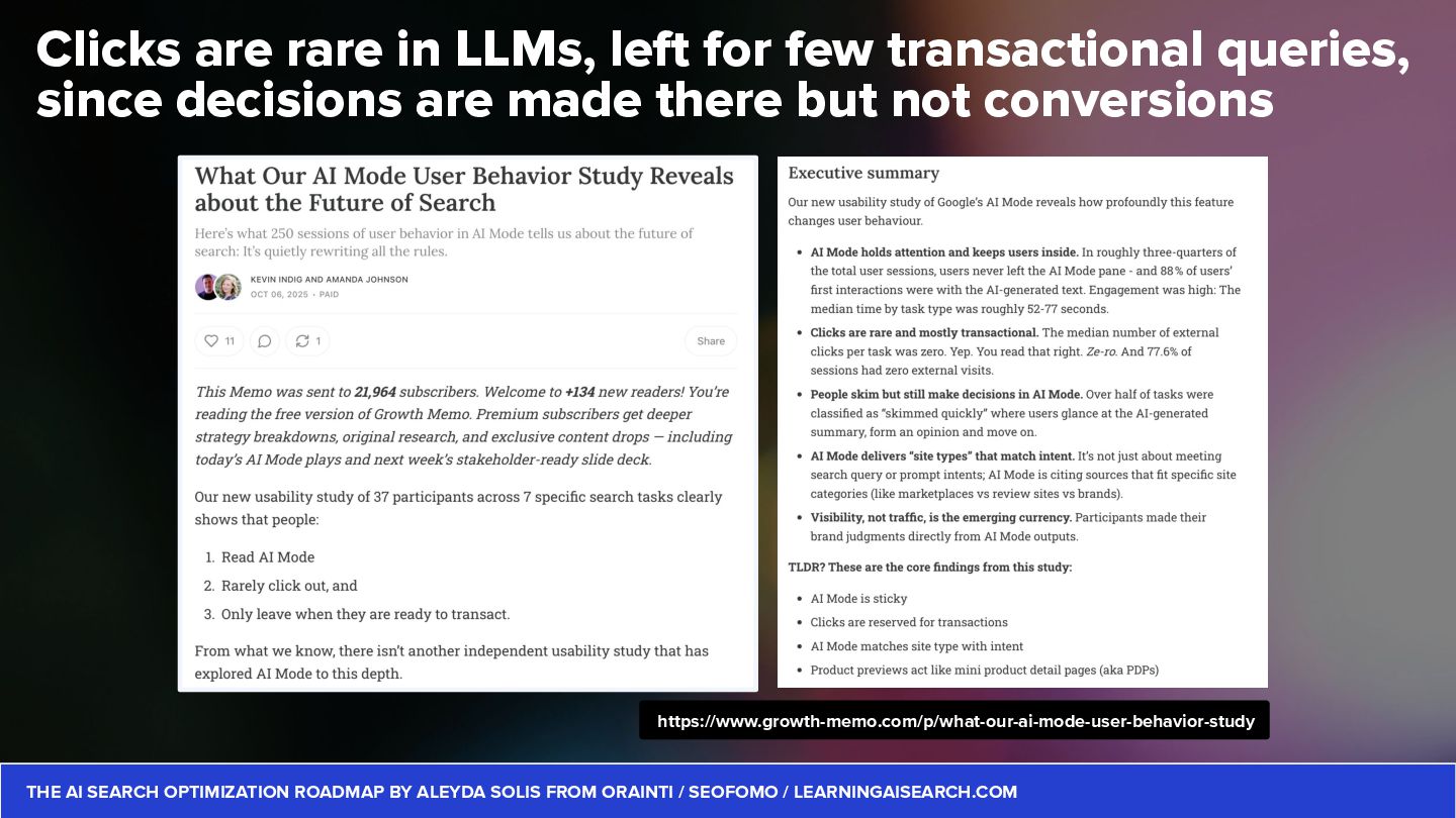 SEOFOMO / LEARNINGAISEARCH.COM THE AI SEARCH OPTIMIZATION ROADMAP BY ALEYDA SOLIS FROM ORAINTI / SEOFOMO / LEARNINGAISEARCH.COM https://www.growth-memo.com/p/what-our-ai-mode-user-behavior-study Clicks are rare in LLMs, left for few transactional queries, since decisions are made there but not conversions