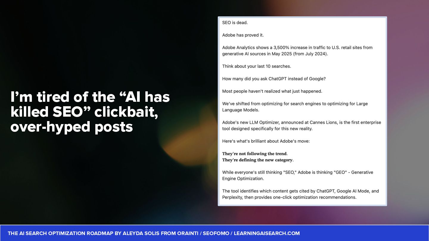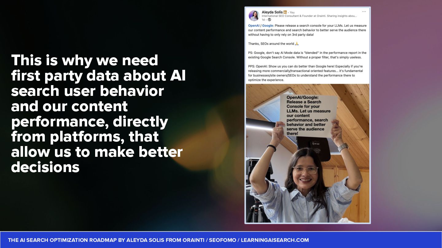 SEOFOMO / LEARNINGAISEARCH.COM THE AI SEARCH OPTIMIZATION ROADMAP BY ALEYDA SOLIS FROM ORAINTI / SEOFOMO / LEARNINGAISEARCH.COM This is why we need first party data about AI search user behavior and our content performance, directly from platforms, that allow us to make better decisions