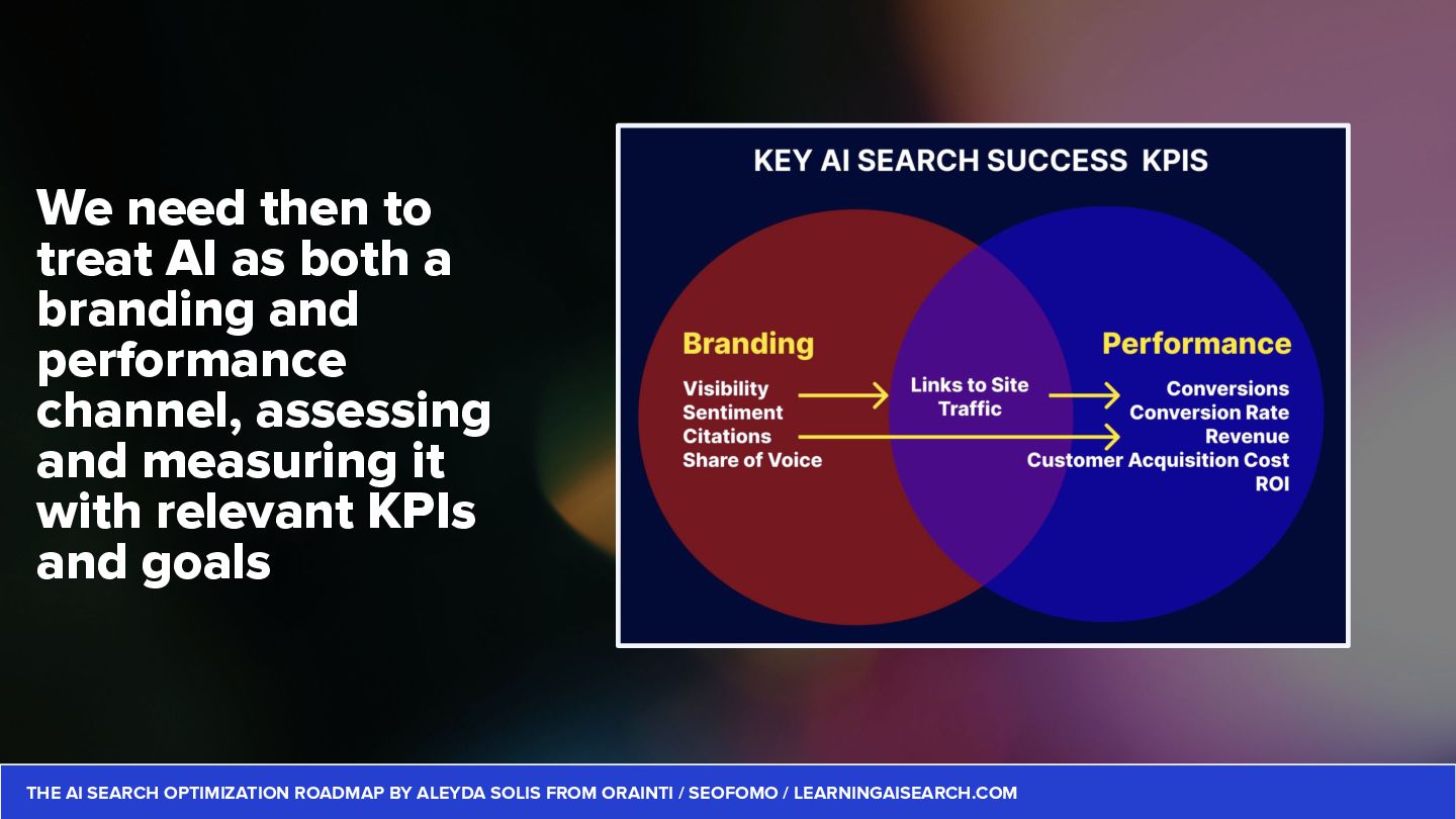 SEOFOMO / LEARNINGAISEARCH.COM THE AI SEARCH OPTIMIZATION ROADMAP BY ALEYDA SOLIS FROM ORAINTI / SEOFOMO / LEARNINGAISEARCH.COM We need then to treat AI as both a branding and performance channel, assessing and measuring it with relevant KPIs and goals
