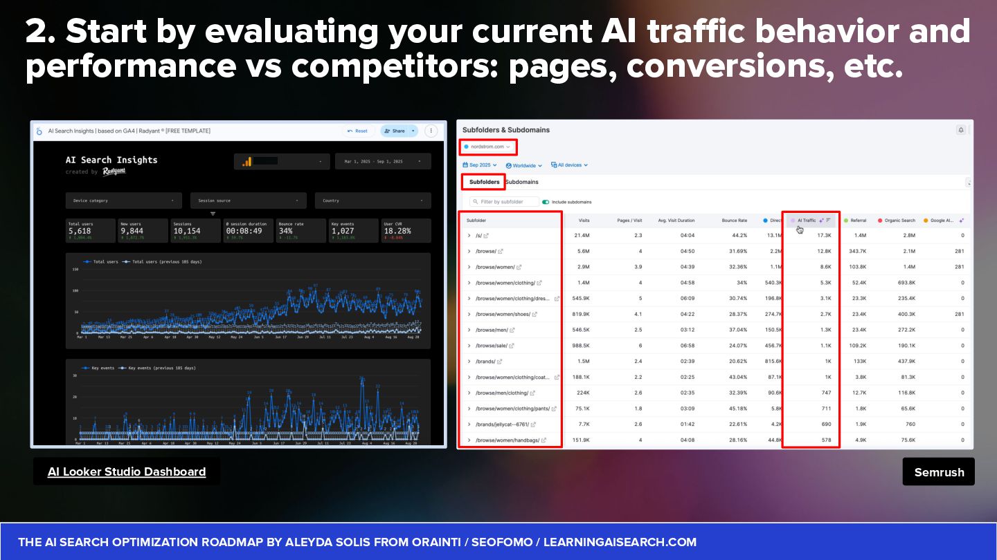 performance vs competitors: pages, conversions, etc. AI Looker Studio Dashboard WINNING ECOMMERCE AI SEARCH BY ALEYDA SOLIS FROM ORAINTI / SEOFOMO / LEARNINGAISEARCH.COM THE AI SEARCH OPTIMIZATION ROADMAP BY ALEYDA SOLIS FROM ORAINTI / SEOFOMO / LEARNINGAISEARCH.COM Semrush