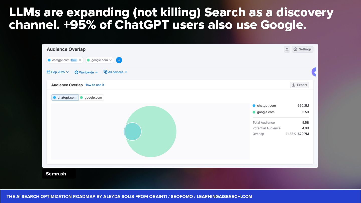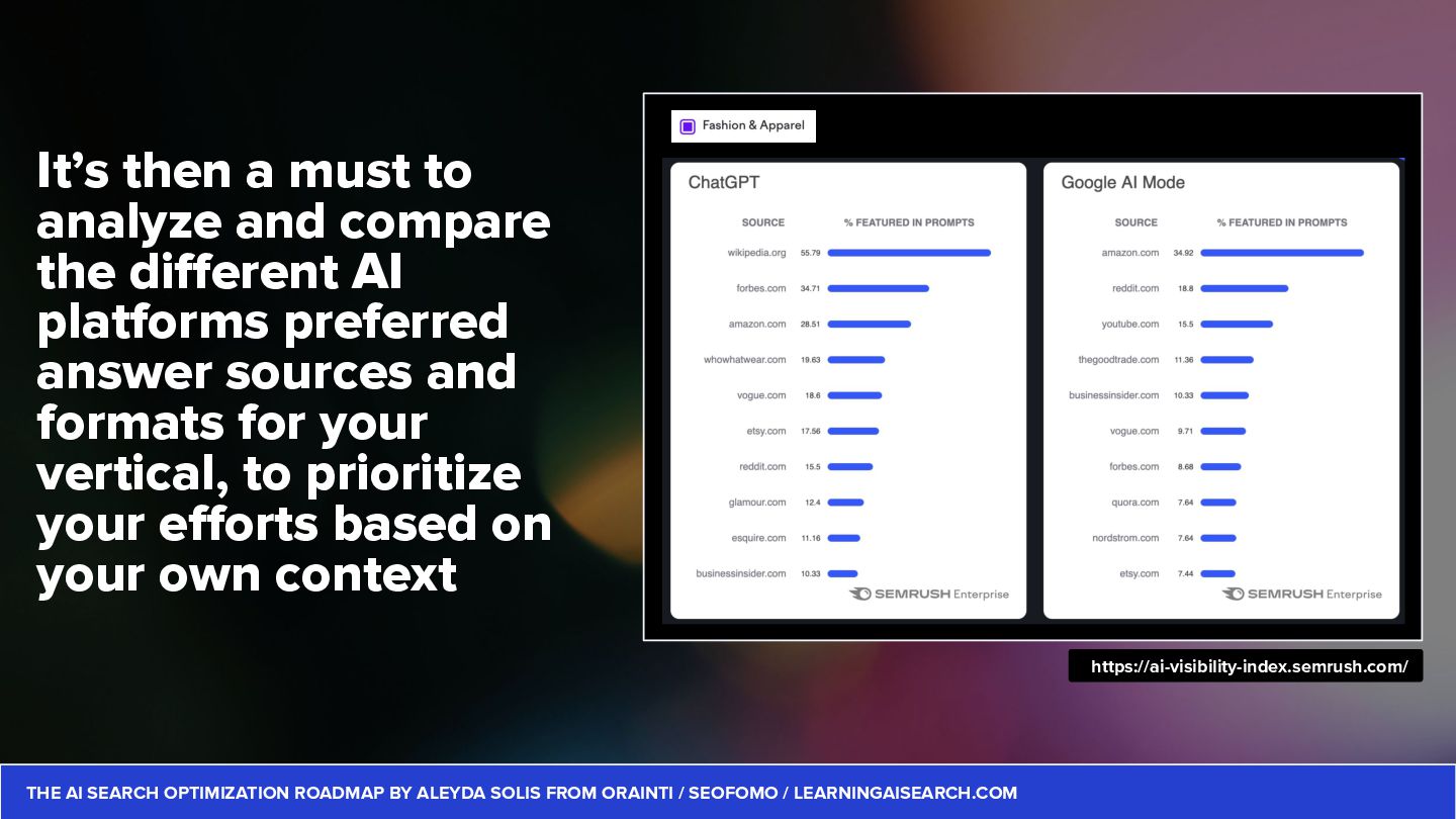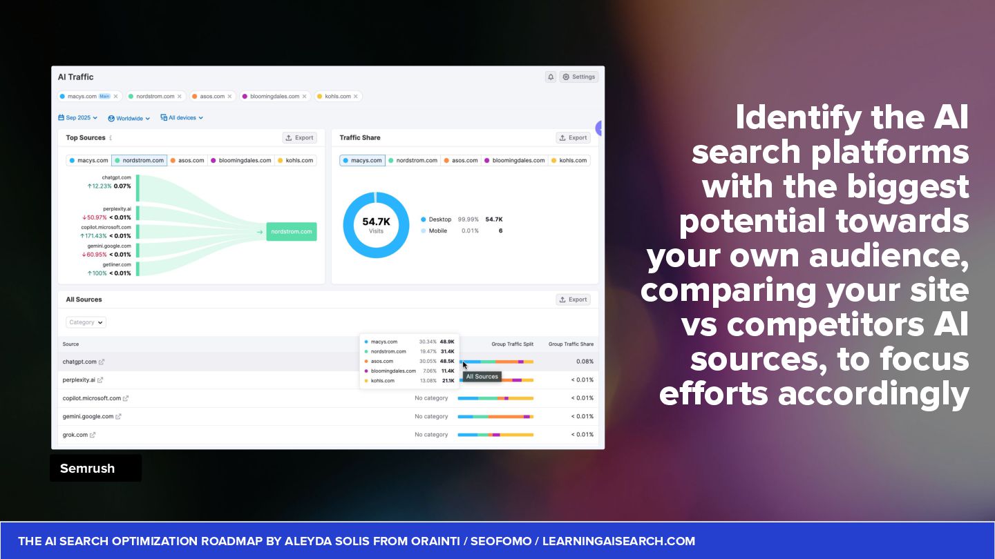 SEOFOMO / LEARNINGAISEARCH.COM THE AI SEARCH OPTIMIZATION ROADMAP BY ALEYDA SOLIS FROM ORAINTI / SEOFOMO / LEARNINGAISEARCH.COM Semrush Identify the AI search platforms with the biggest potential towards your own audience, comparing your site vs competitors AI sources, to focus efforts accordingly