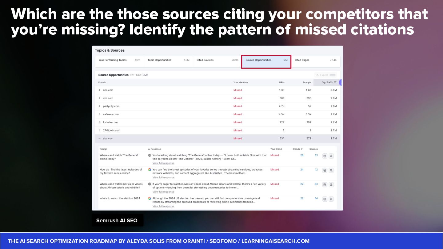 SEOFOMO / LEARNINGAISEARCH.COM THE AI SEARCH OPTIMIZATION ROADMAP BY ALEYDA SOLIS FROM ORAINTI / SEOFOMO / LEARNINGAISEARCH.COM Which are the those sources citing your competitors that you’re missing? Identify the pattern of missed citations Semrush AI SEO