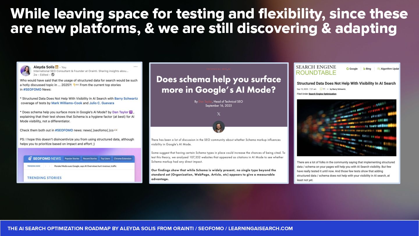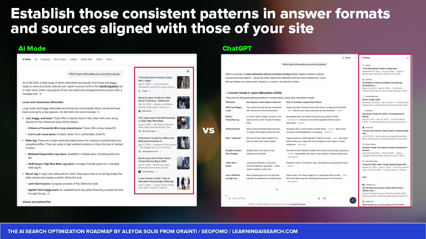 SEOFOMO / LEARNINGAISEARCH.COM THE AI SEARCH OPTIMIZATION ROADMAP BY ALEYDA SOLIS FROM ORAINTI / SEOFOMO / LEARNINGAISEARCH.COM Establish those consistent patterns in answer formats and sources aligned with those of your site vs AI Mode ChatGPT