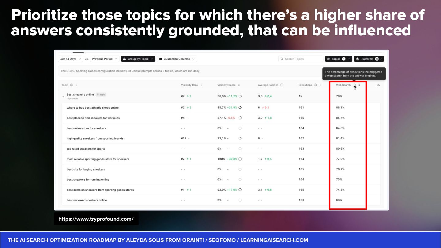 SEOFOMO / LEARNINGAISEARCH.COM Prioritize those topics for which there’s a higher share of answers consistently grounded, that can be influenced THE AI SEARCH OPTIMIZATION ROADMAP BY ALEYDA SOLIS FROM ORAINTI / SEOFOMO / LEARNINGAISEARCH.COM https://www.tryprofound.com/