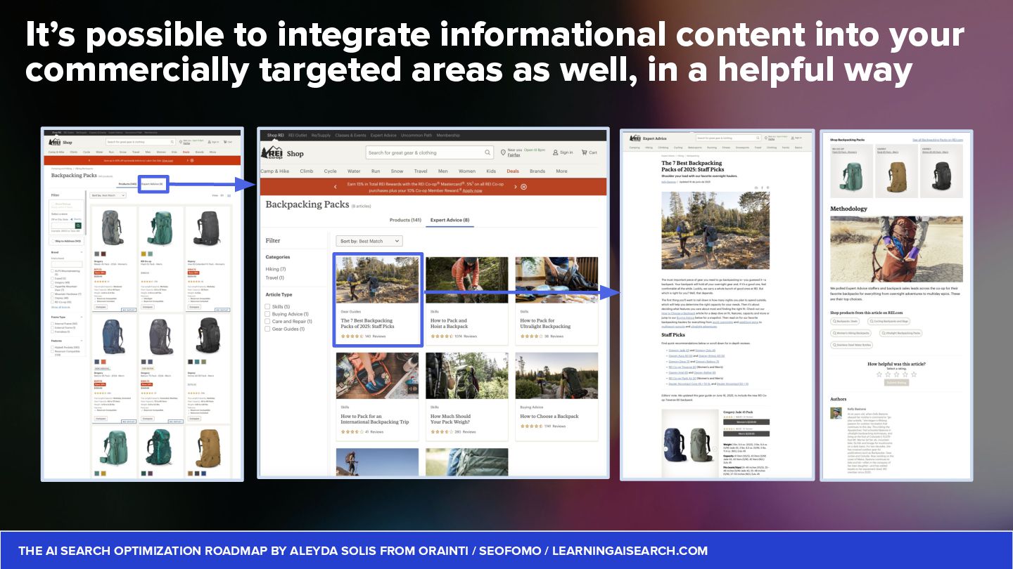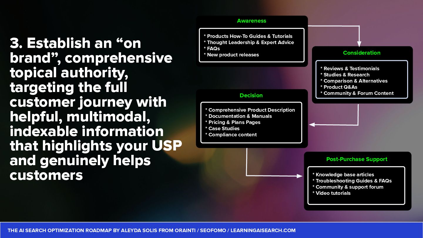 full customer journey with helpful, multimodal, indexable information that highlights your USP and genuinely helps customers Consideration * Reviews & Testimonials * Studies & Research * Comparison & Alternatives * Product Q&As * Community & Forum Content Decision * Comprehensive Product Description * Documentation & Manuals * Pricing & Plans Pages * Case Studies * Compliance content * Knowledge base articles * Troubleshooting Guides & FAQs * Community & support forum * Video tutorials Post-Purchase Support * Products How-To Guides & Tutorials * Thought Leadership & Expert Advice * FAQs * New product releases Awareness WINNING ECOMMERCE AI SEARCH BY ALEYDA SOLIS FROM ORAINTI / SEOFOMO / LEARNINGAISEARCH.COM THE AI SEARCH OPTIMIZATION ROADMAP BY ALEYDA SOLIS FROM ORAINTI / SEOFOMO / LEARNINGAISEARCH.COM