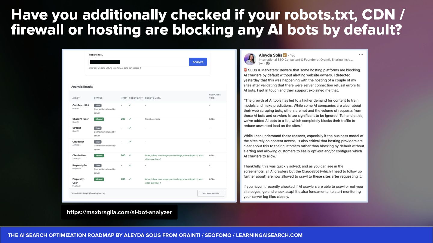 or hosting are blocking any AI bots by default? https://maxbraglia.com/ai-bot-analyzer WINNING ECOMMERCE AI SEARCH BY ALEYDA SOLIS FROM ORAINTI / SEOFOMO / LEARNINGAISEARCH.COM THE AI SEARCH OPTIMIZATION ROADMAP BY ALEYDA SOLIS FROM ORAINTI / SEOFOMO / LEARNINGAISEARCH.COM