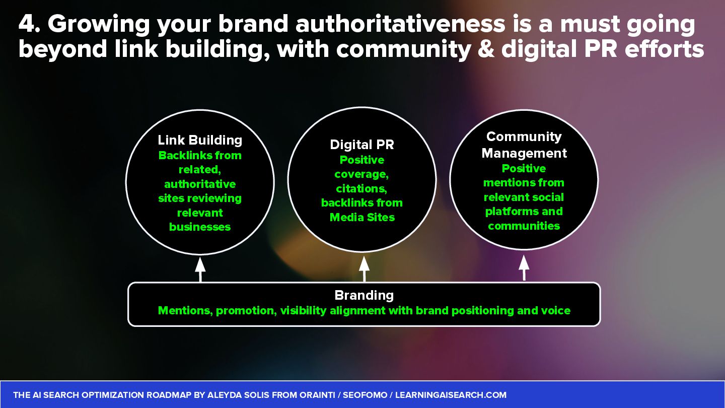 Management Positive mentions from relevant social platforms and communities Link Building Backlinks from related, authoritative sites reviewing relevant businesses Branding Mentions, promotion, visibility alignment with brand positioning and voice 4. Growing your brand authoritativeness is a must going beyond link building, with community & digital PR efforts WINNING ECOMMERCE AI SEARCH BY ALEYDA SOLIS FROM ORAINTI / SEOFOMO / LEARNINGAISEARCH.COM THE AI SEARCH OPTIMIZATION ROADMAP BY ALEYDA SOLIS FROM ORAINTI / SEOFOMO / LEARNINGAISEARCH.COM