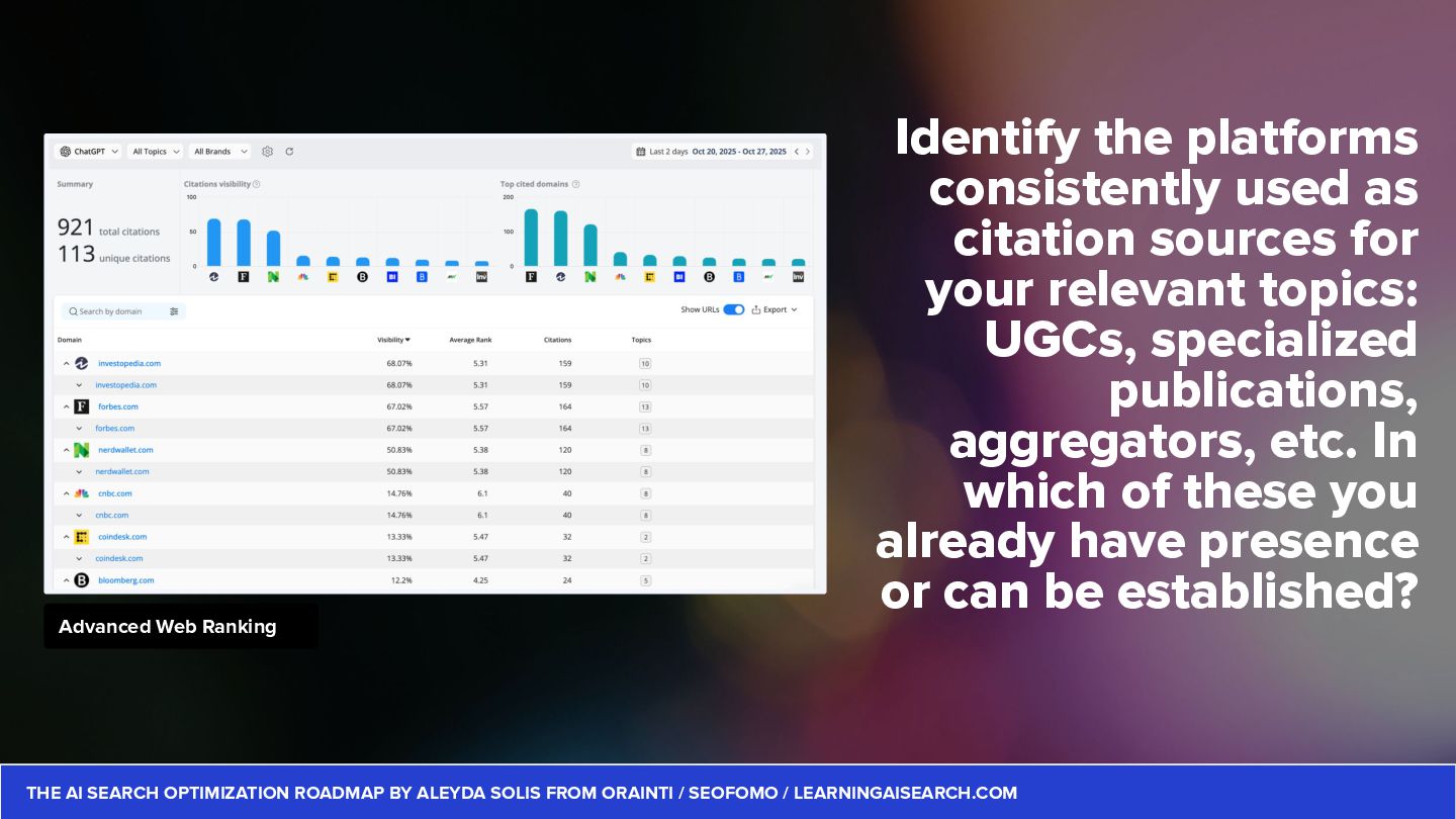 sources for your relevant topics: UGCs, specialized publications, aggregators, etc. In which of these you already have presence or can be established? WINNING ECOMMERCE AI SEARCH BY ALEYDA SOLIS FROM ORAINTI / SEOFOMO / LEARNINGAISEARCH.COM THE AI SEARCH OPTIMIZATION ROADMAP BY ALEYDA SOLIS FROM ORAINTI / SEOFOMO / LEARNINGAISEARCH.COM