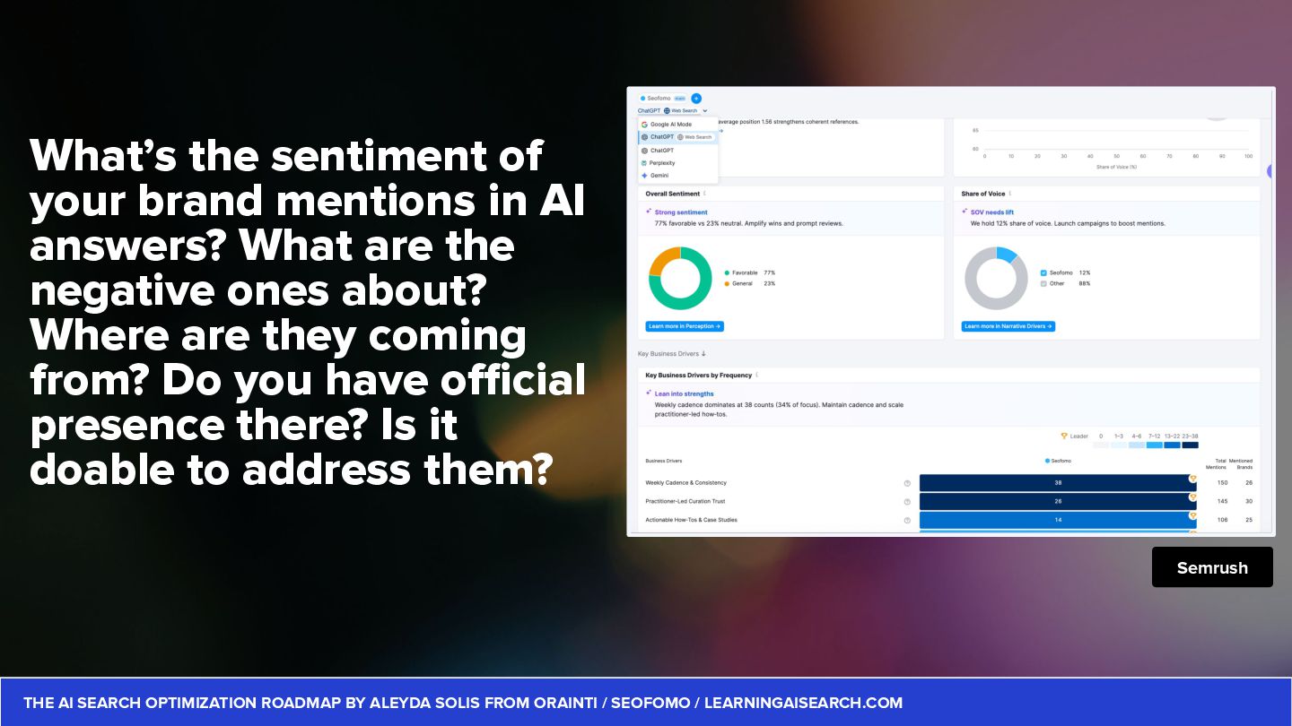 SEOFOMO / LEARNINGAISEARCH.COM THE AI SEARCH OPTIMIZATION ROADMAP BY ALEYDA SOLIS FROM ORAINTI / SEOFOMO / LEARNINGAISEARCH.COM Backlinks are not a requirement anymore, but preferred. Mentions should be positive and brand aligned too. Semrush