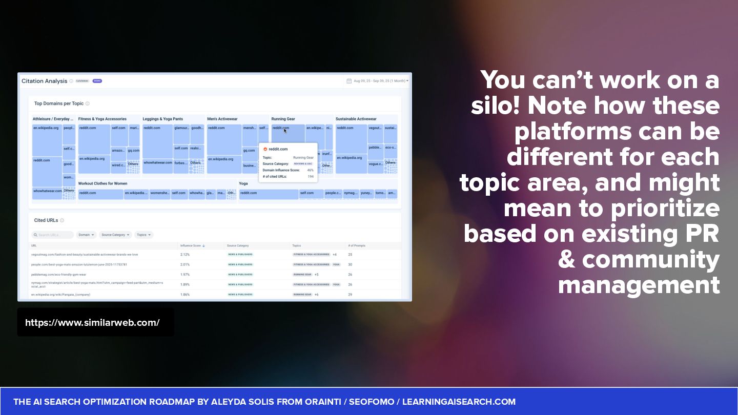 / SEOFOMO / LEARNINGAISEARCH.COM THE AI SEARCH OPTIMIZATION ROADMAP BY ALEYDA SOLIS FROM ORAINTI / SEOFOMO / LEARNINGAISEARCH.COM You can’t work on a silo! Note how these platforms can be different for each topic area, and might mean to prioritize based on existing PR & community management