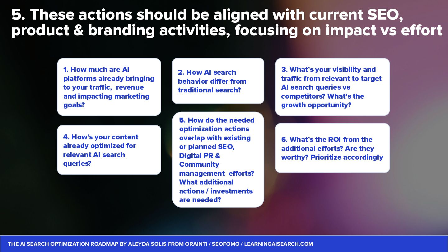 & branding activities, focusing on impact vs effort 1. How much are AI platforms already bringing to your traffic, revenue and impacting marketing goals? 2. How AI search behavior differ from traditional search? 3. What’s your visibility and traffic from relevant to target AI search queries vs competitors? What’s the growth opportunity? 4. How’s your content already optimized for relevant AI search queries? 5. How do the needed optimization actions overlap with existing or planned SEO, Digital PR & Community management efforts? What additional actions / investments are needed? 6. What’s the ROI from the additional efforts? Are they worthy? Prioritize accordingly WINNING ECOMMERCE AI SEARCH BY ALEYDA SOLIS FROM ORAINTI / SEOFOMO / LEARNINGAISEARCH.COM THE AI SEARCH OPTIMIZATION ROADMAP BY ALEYDA SOLIS FROM ORAINTI / SEOFOMO / LEARNINGAISEARCH.COM
