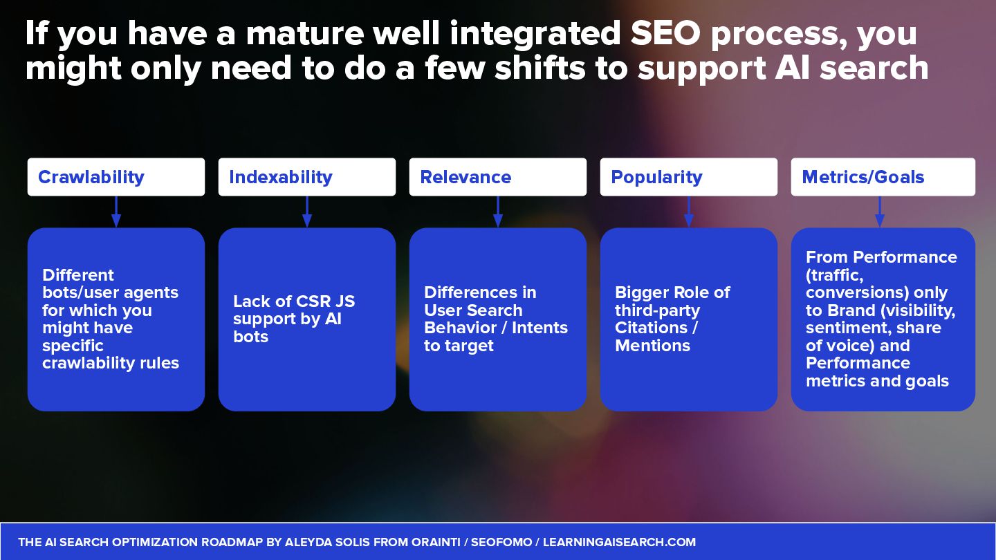 might only need to do a few shifts to support AI search Differences in User Search Behavior / Intents to target Bigger Role of third-party Citations / Mentions Different bots/user agents for which you might have specific crawlability rules Lack of CSR JS support by AI bots From Performance (traffic, conversions) only to Brand (visibility, sentiment, share of voice) and Performance metrics and goals Crawlability Indexability Relevance Popularity Metrics/Goals WINNING ECOMMERCE AI SEARCH BY ALEYDA SOLIS FROM ORAINTI / SEOFOMO / LEARNINGAISEARCH.COM THE AI SEARCH OPTIMIZATION ROADMAP BY ALEYDA SOLIS FROM ORAINTI / SEOFOMO / LEARNINGAISEARCH.COM