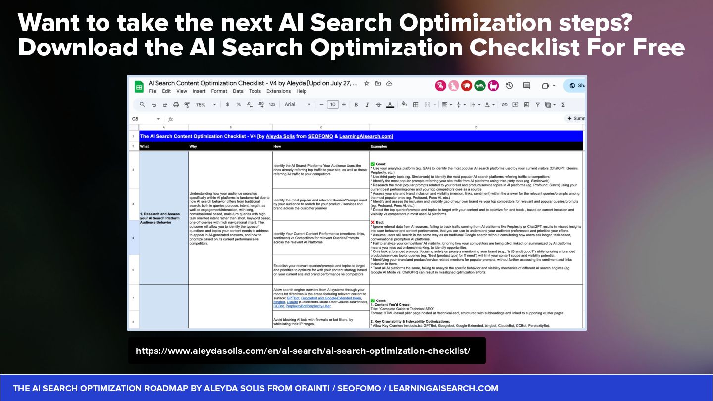 the AI Search Optimization Checklist For Free https://www.aleydasolis.com/en/ai-search/ai-search-optimization-checklist/ WINNING ECOMMERCE AI SEARCH BY ALEYDA SOLIS FROM ORAINTI / SEOFOMO / LEARNINGAISEARCH.COM THE AI SEARCH OPTIMIZATION ROADMAP BY ALEYDA SOLIS FROM ORAINTI / SEOFOMO / LEARNINGAISEARCH.COM