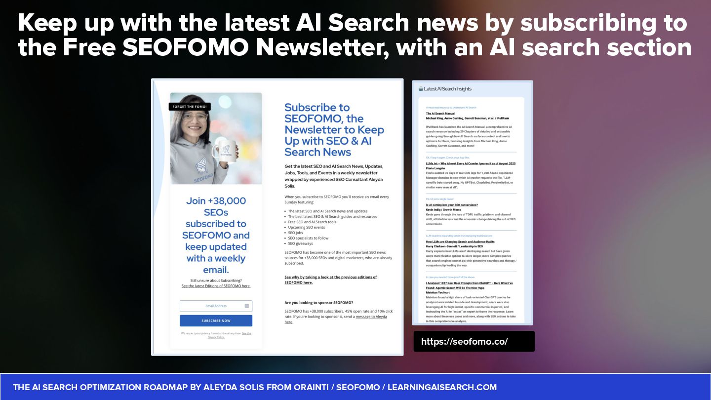 to the Free SEOFOMO Newsletter, with an AI search section https://seofomo.co/ WINNING ECOMMERCE AI SEARCH BY ALEYDA SOLIS FROM ORAINTI / SEOFOMO / LEARNINGAISEARCH.COM THE AI SEARCH OPTIMIZATION ROADMAP BY ALEYDA SOLIS FROM ORAINTI / SEOFOMO / LEARNINGAISEARCH.COM