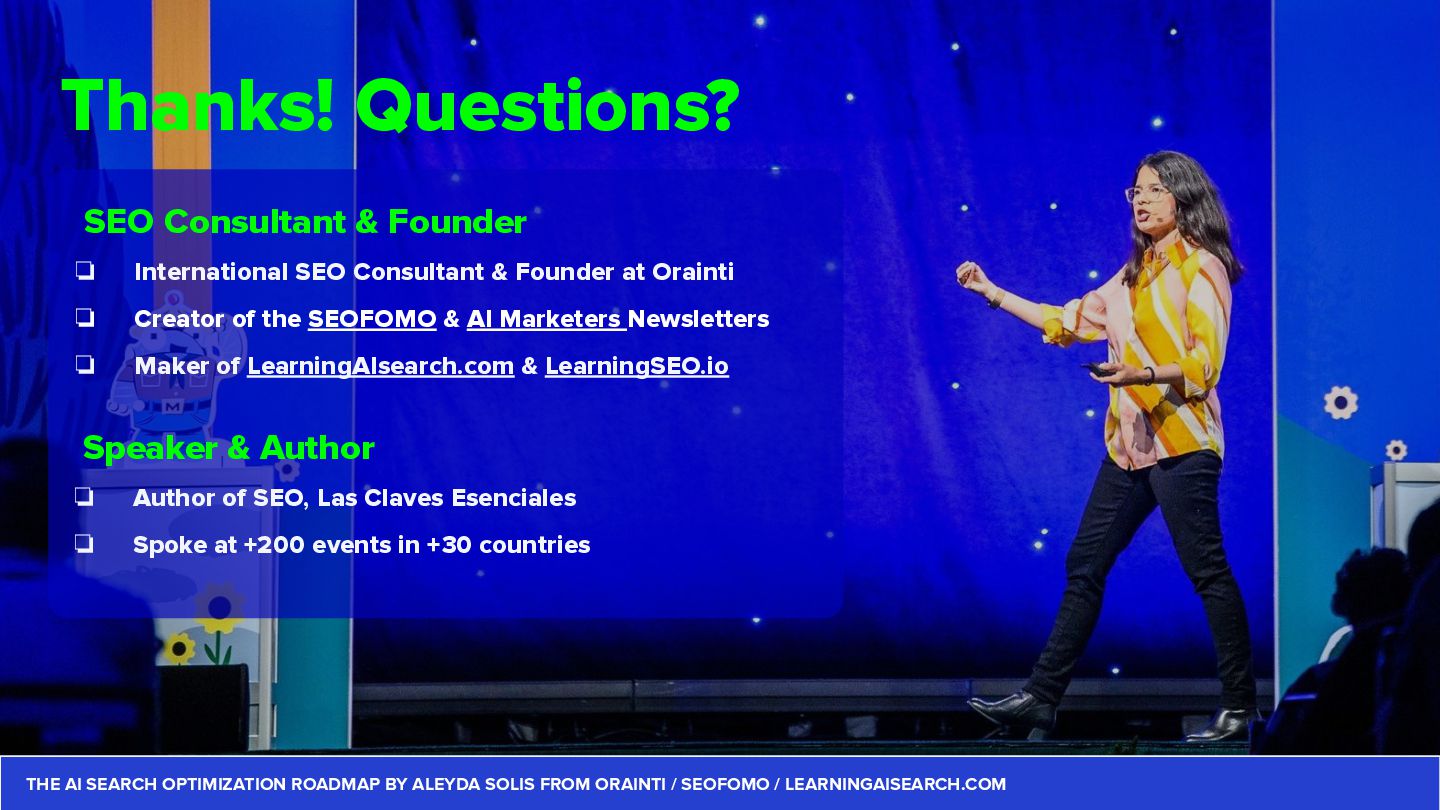 ALEYDA SOLIS FROM ORAINTI / SEOFOMO / LEARNINGAISEARCH.COM SEO Consultant & Founder ❏ International SEO Consultant & Founder at Orainti ❏ Creator of the SEOFOMO & AI Marketers Newsletters ❏ Maker of LearningAIsearch.com & LearningSEO.io Speaker & Author ❏ Author of SEO, Las Claves Esenciales ❏ Spoke at +200 events in +30 countries