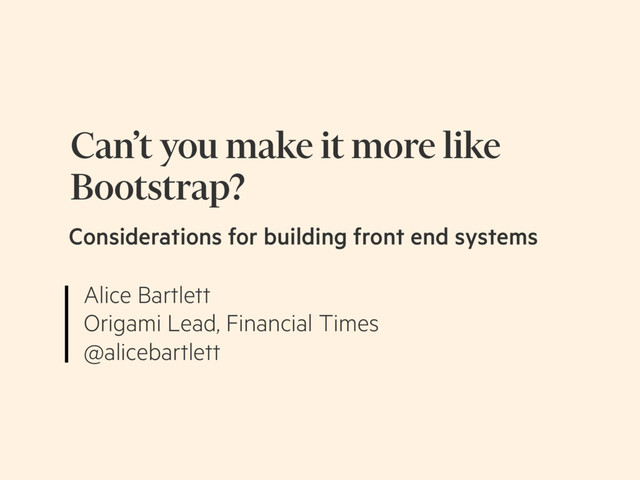 Slides from a talk I gave at June's MK Geek Night. This talk covers what the FT is doing to unify design across the FT and speed up development time.