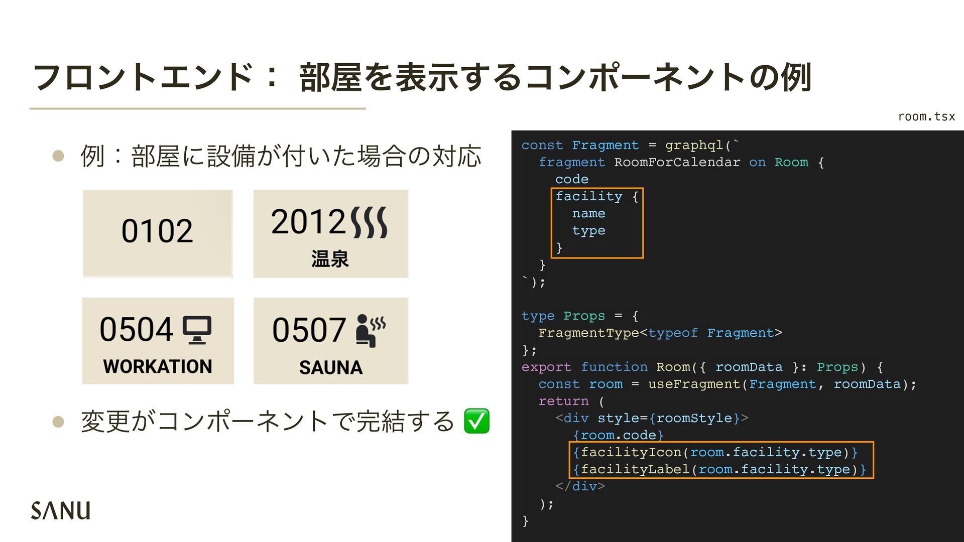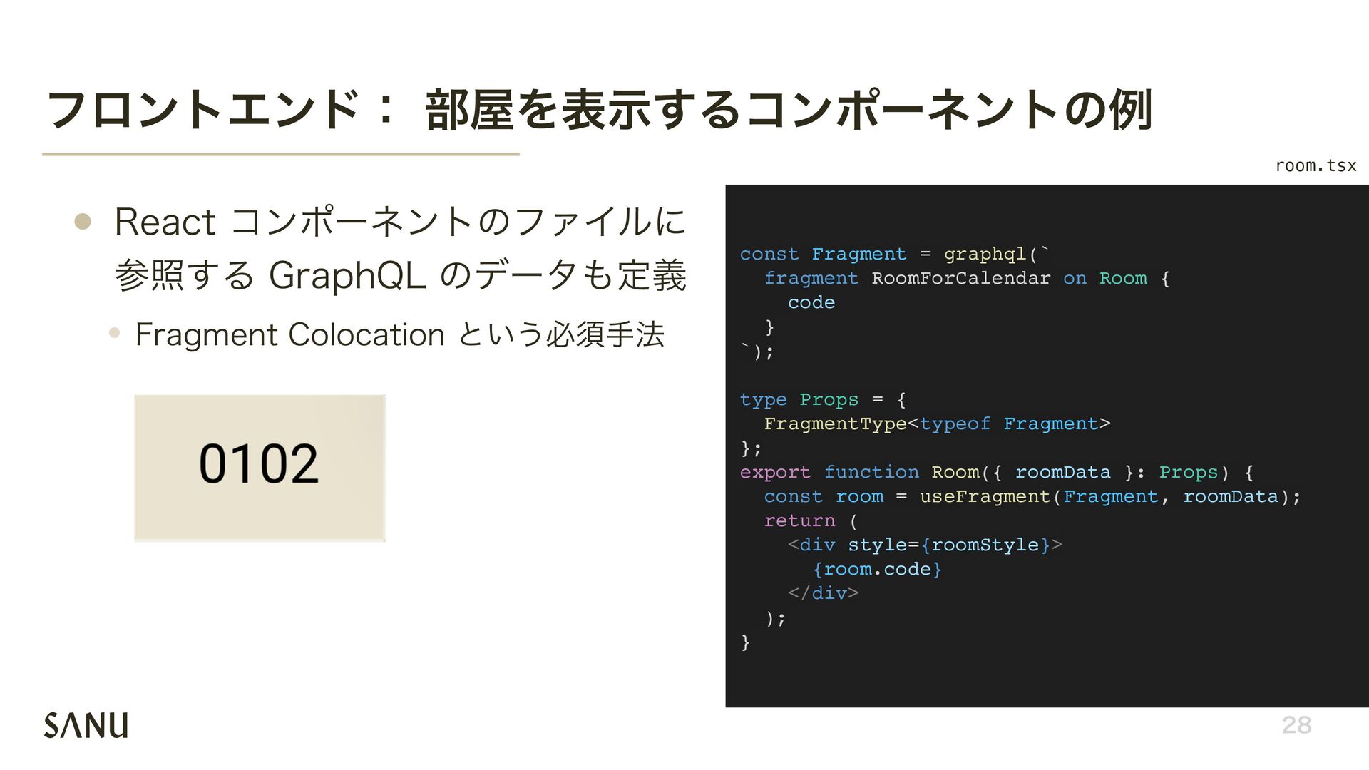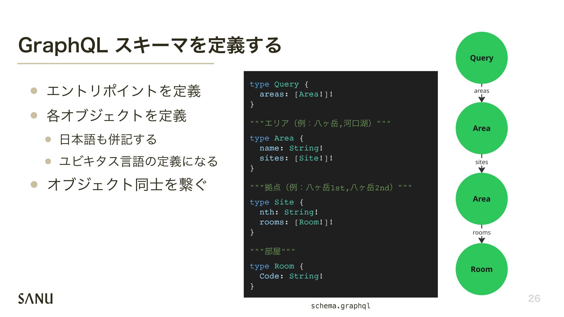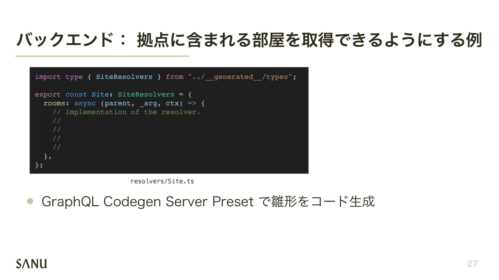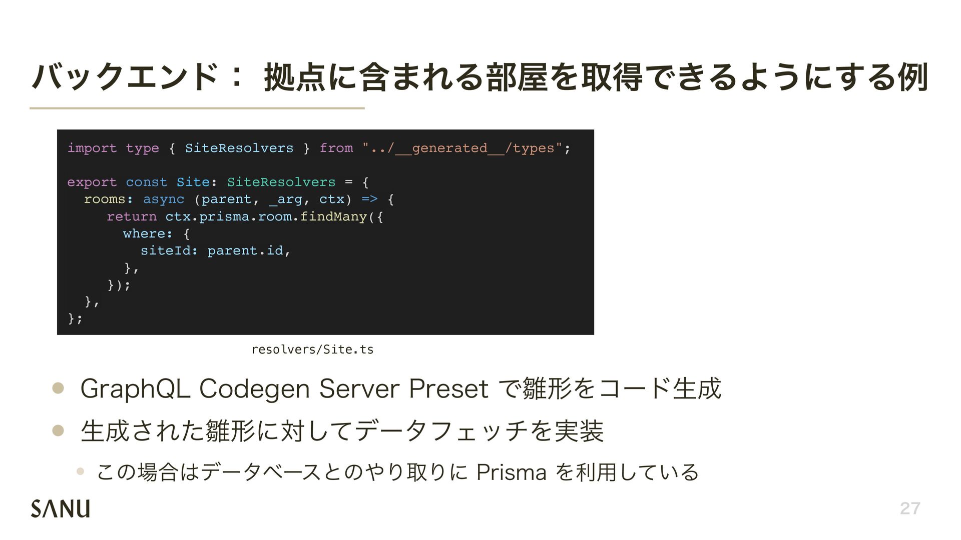 "../__generated__/types"; export const Site: SiteResolvers = { rooms: async (parent, _arg, ctx) => { // Implementation of the resolver. // // // // }, }; resolvers/Site.ts • ੜ͞Εͨܗʹରͯ͠σʔλϑΣονΛ࣮ • ͜ͷ߹σʔλϕʔεͱͷΓऔΓʹ1SJTNBΛར༻͍ͯ͠Δ return ctx.prisma.room.findMany({ where: { siteId: parent.id, }, });