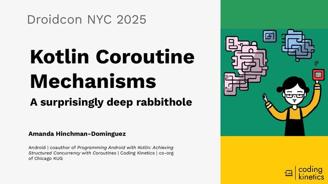 Sometimes you think you know coroutines, and then after a while, you’re like, “Wait, do I really know coroutines?” Inspired by the O’Reilly book _Programming Android with Kotlin_ and the upcoming new Droidcon eBook _Mastering Kotlin Coroutines: From Basics to Advanced _, this talk strengthens everyday coroutine understanding through playful explorations. You don't have to master coroutines to get started and be productive with coroutines. But when you walk out of this talk, you have deep understanding of coroutine mechanics and what tools can help you debug coroutine behavior. You might be in the beginning stages of learning Kotlin. Or maybe you’ve been using coroutines for a while and want to brush up, or maybe you're a little burned from other talks. Either way, you'll be looking at coroutines a little differently by the end of this session!