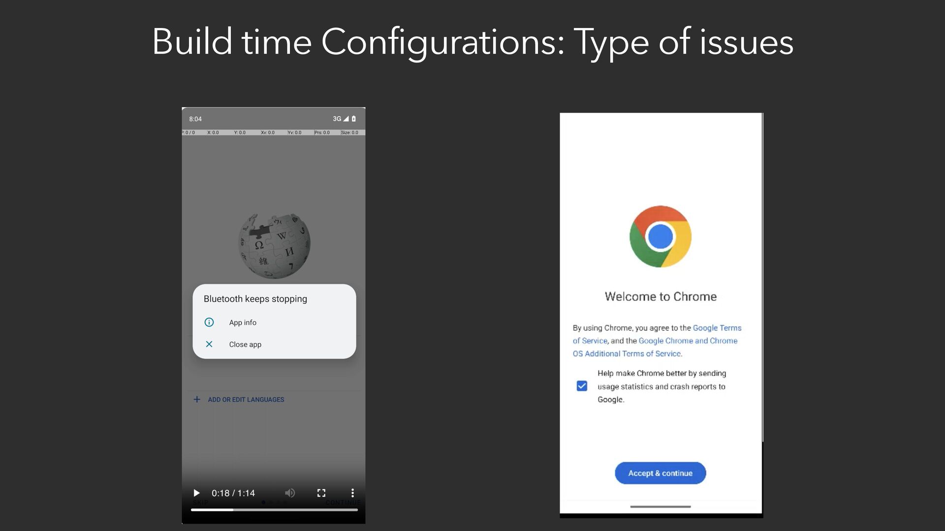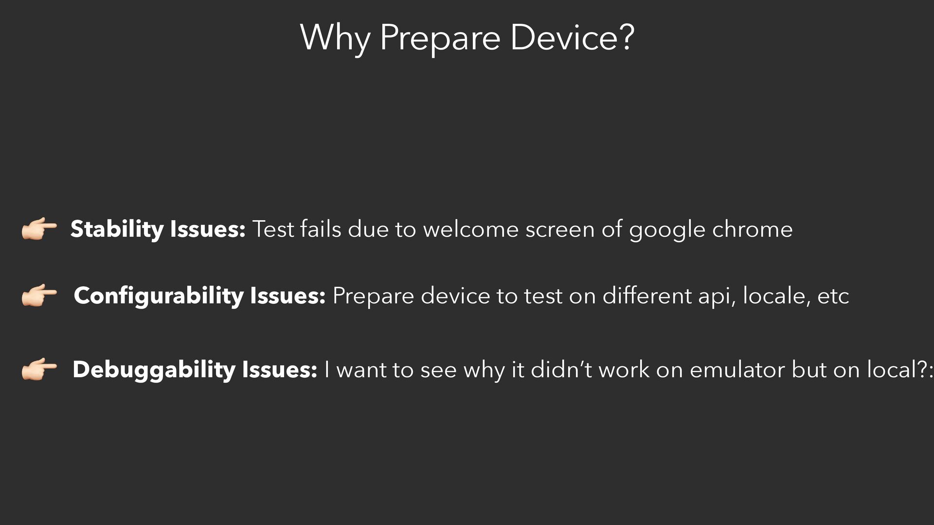 screen of google chrome Con fi gurability Issues: Prepare device to test on different api, locale, etc 👉 👉 Debuggability Issues: I want to see why it didn’t work on emulator but on local?: 👉
