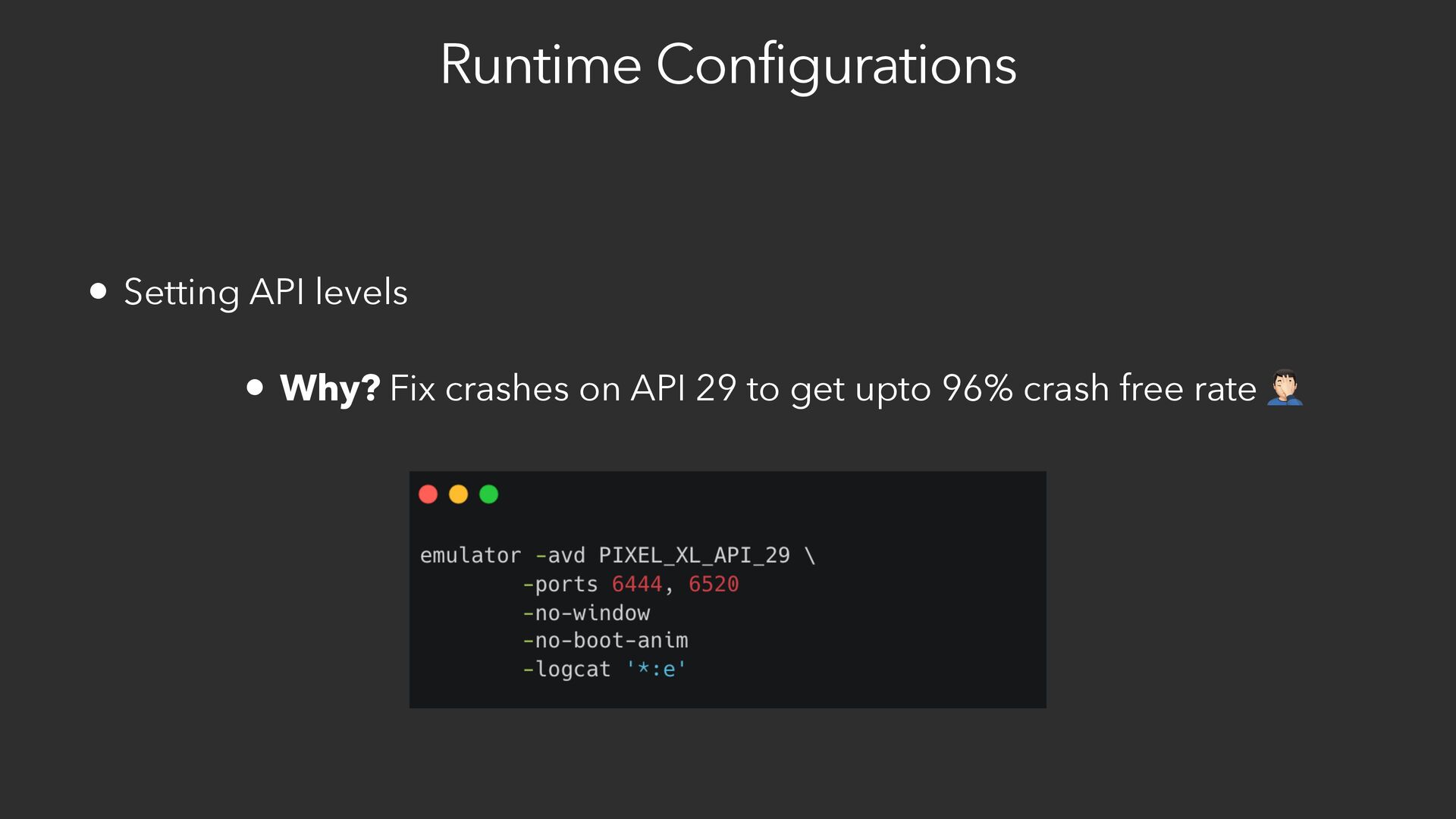 8. Runtime Configurations • Setting API levels • Why? Fix crashes