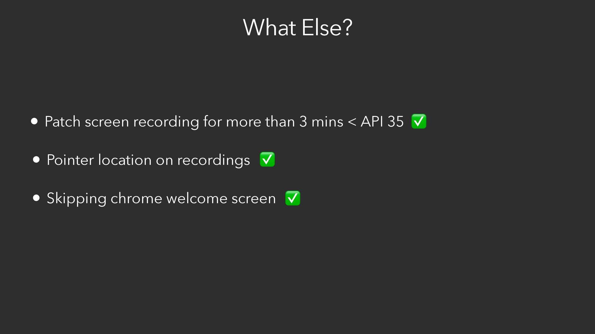 mins < API 35 • Pointer location on recordings ✅ ✅ • Skipping chrome welcome screen ✅