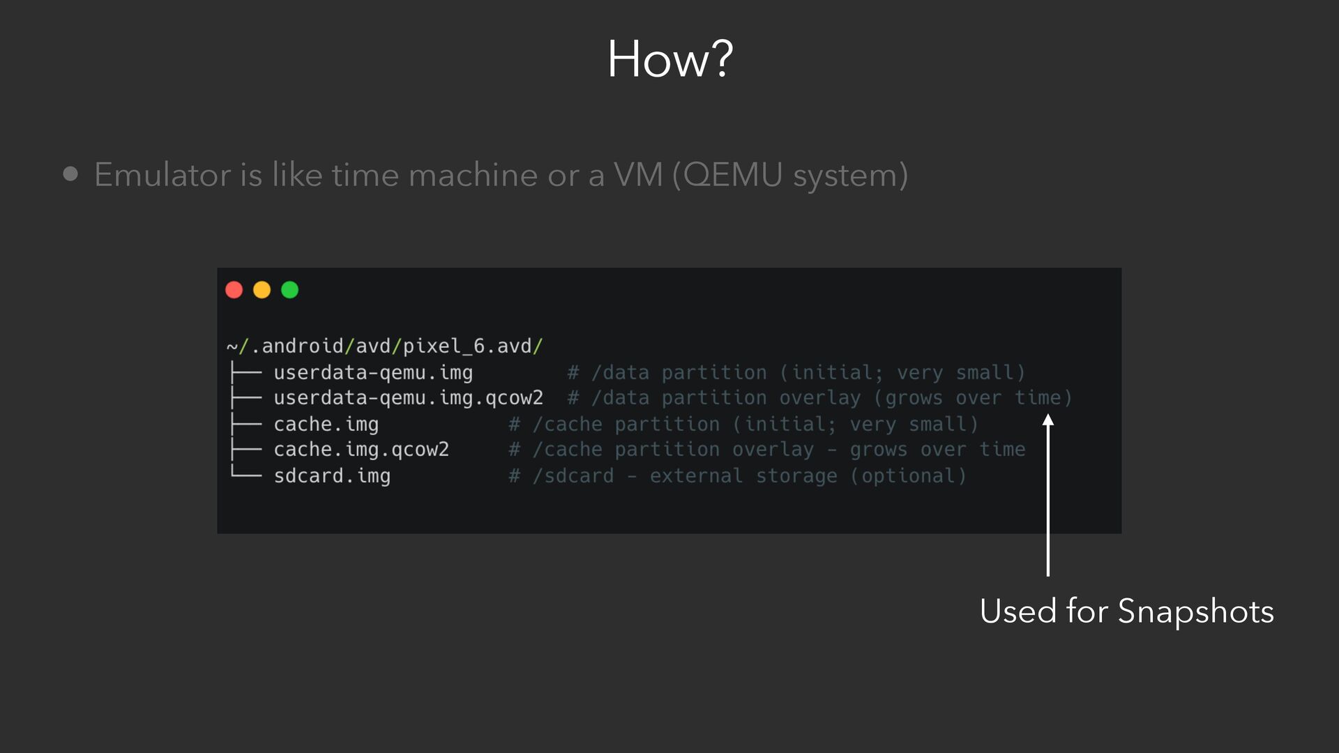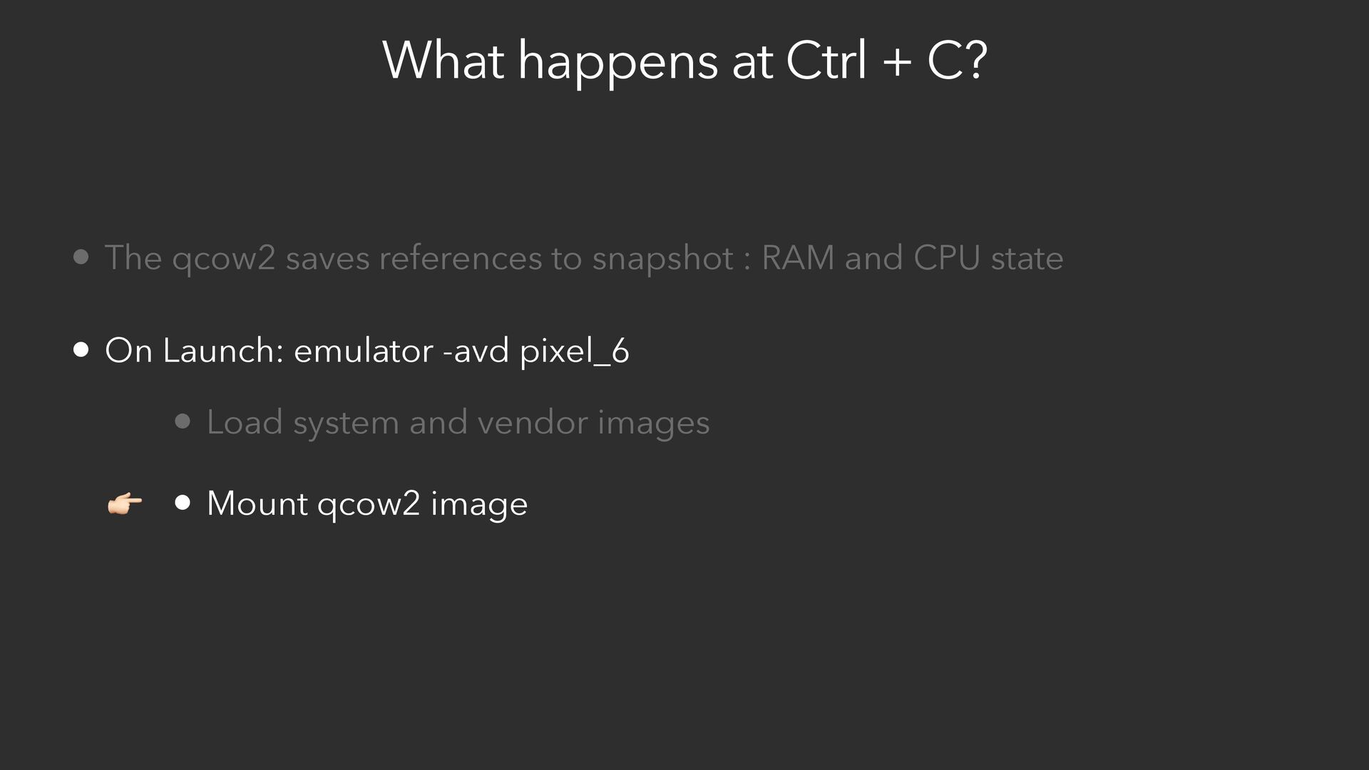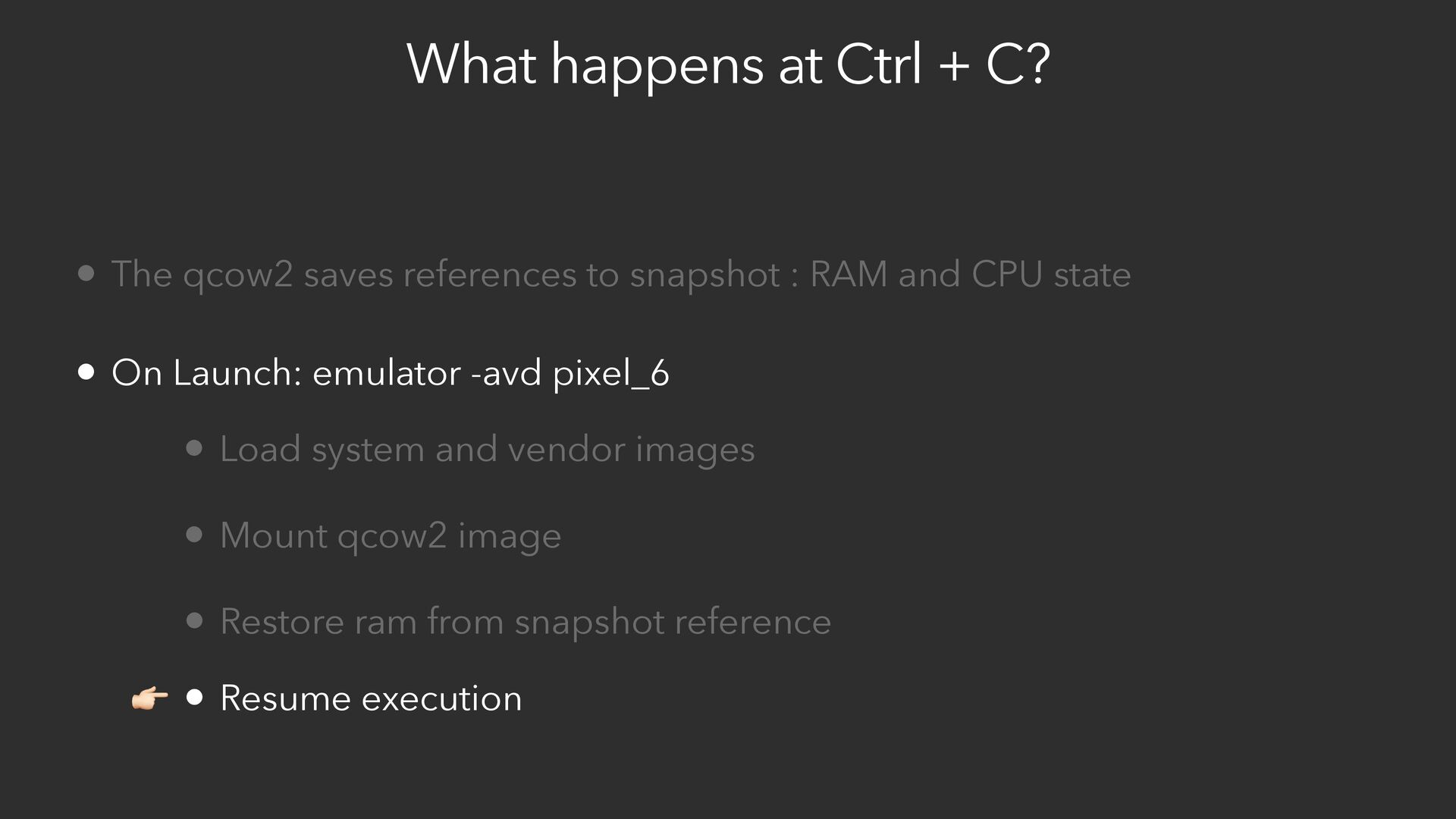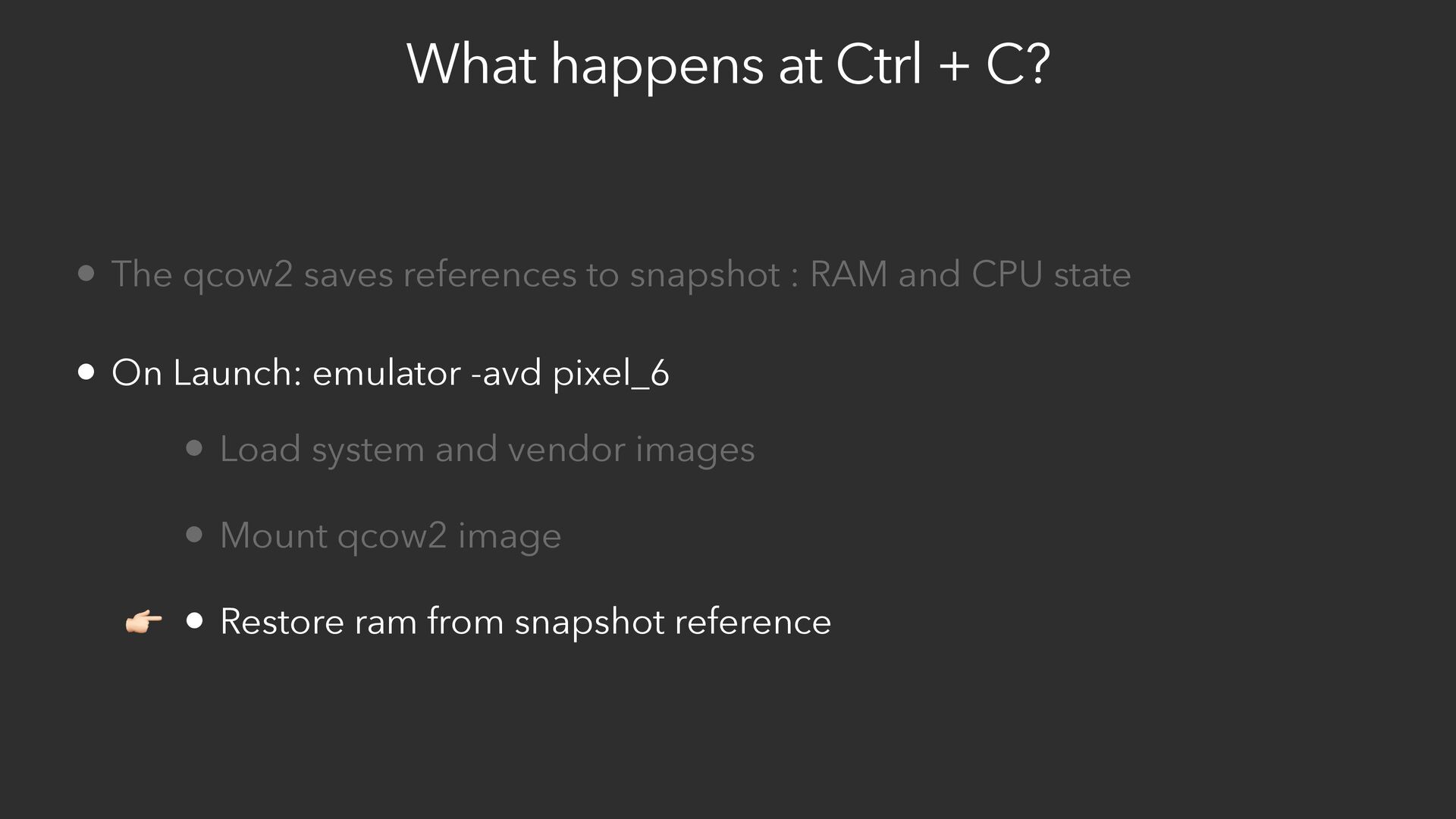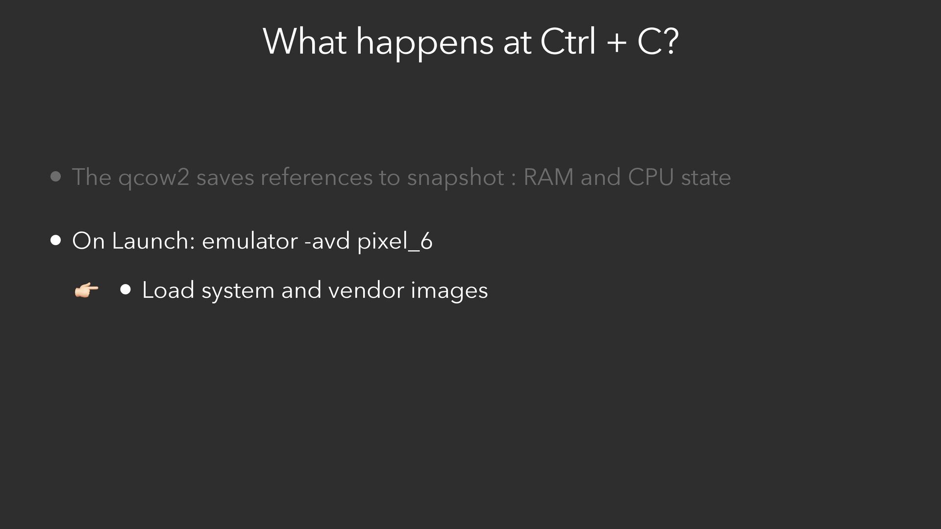 references to snapshot : RAM and CPU state • On Launch: emulator -avd pixel_6 • Load system and vendor images • Mount qcow2 image • Restore ram from snapshot reference 👉