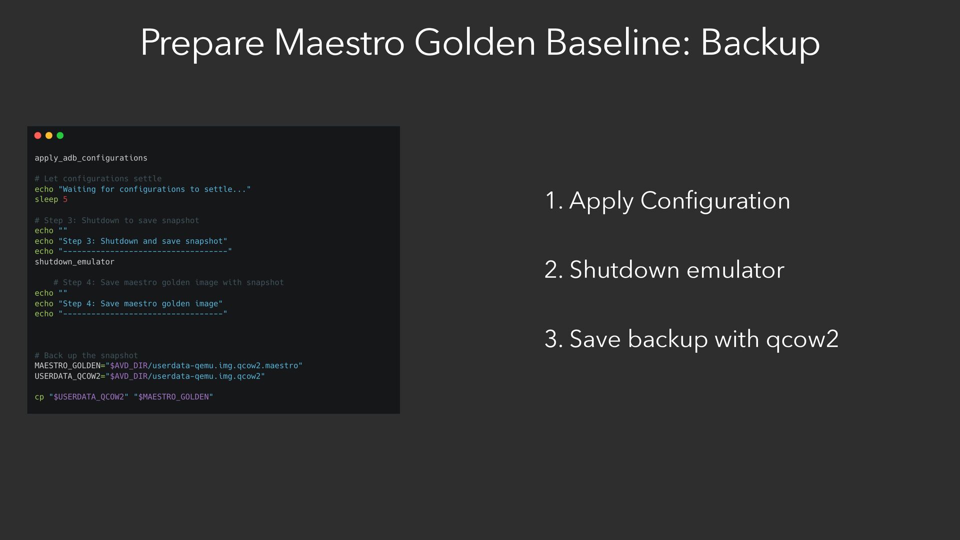 2. Shutdown emulator 3. Save backup with qcow2