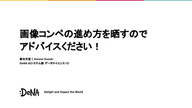 DeNA AIシステム部 データサイエンス(DS)チーム内で行っている輪講で使った資料です。 自分の画像コンペの進め方と、それに対して貰ったフィードバックをまとめた資料になっています。 DSチームの輪講の雰囲気も併せて感じてもらえると嬉しいです!