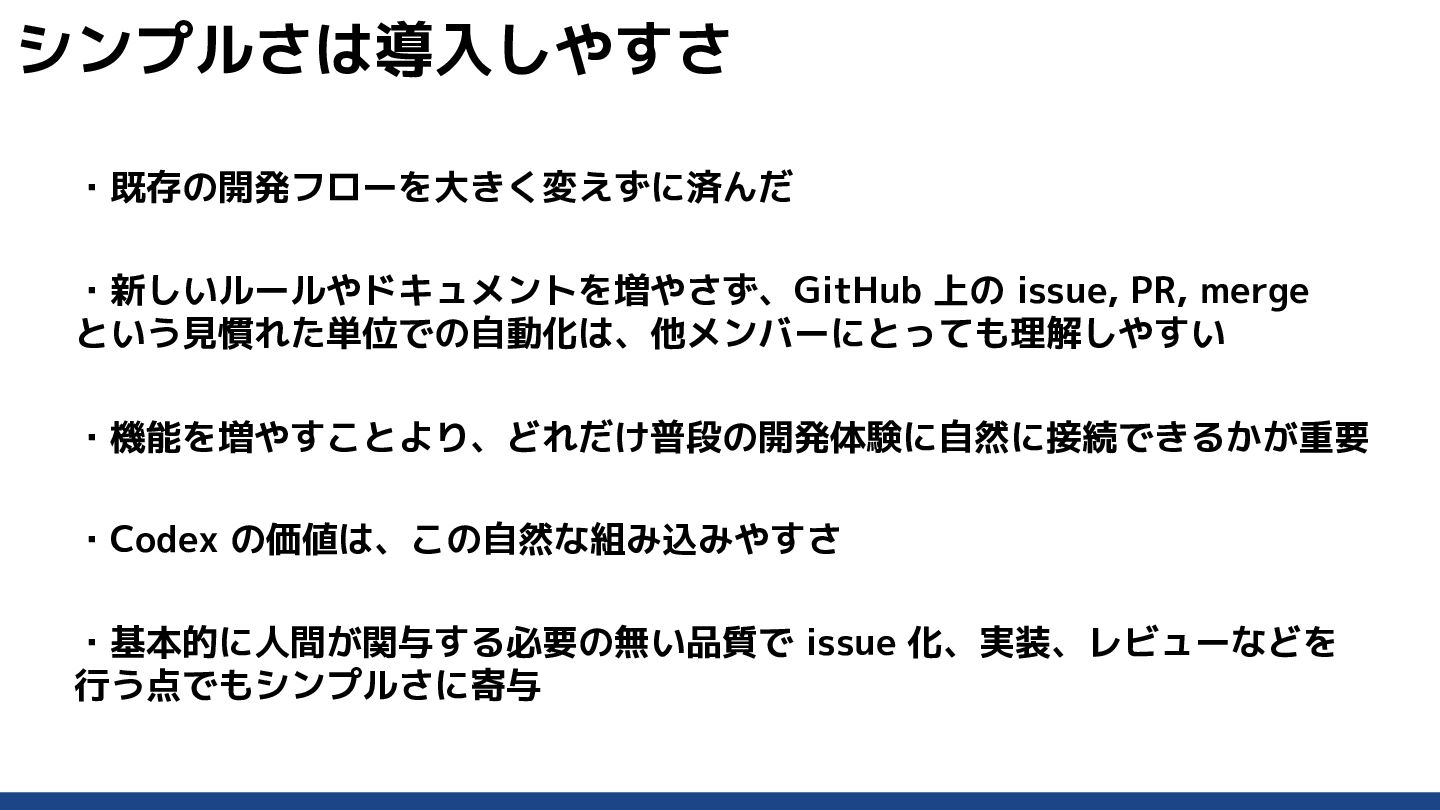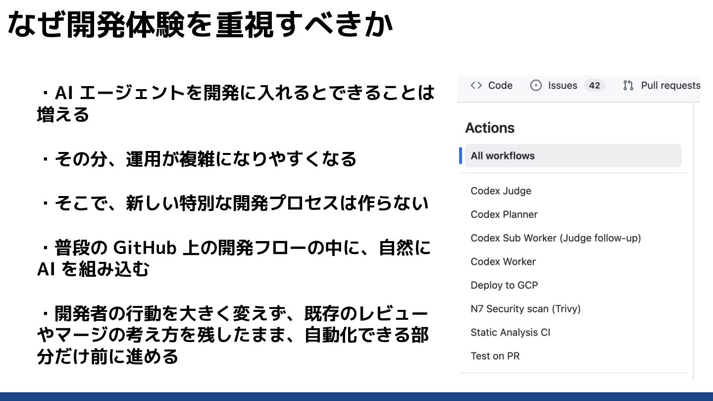 ・開発者の行動を大きく変えず、既存のレビュー やマージの考え方を残したまま、自動化できる部 分だけ前に進める なぜ開発体験を重視すべきか