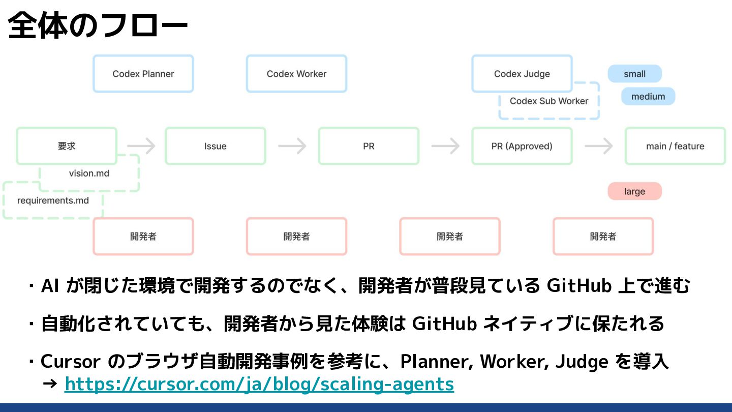 1. ・AI エージェントを開発に入れるとできることは 増える ・その分、運用が複雑になりやすくなる ・そこで、新しい特別な開発プロセスは作らない ・普段の GitHub 上の開発フローの中に、自然に AI を組み込む