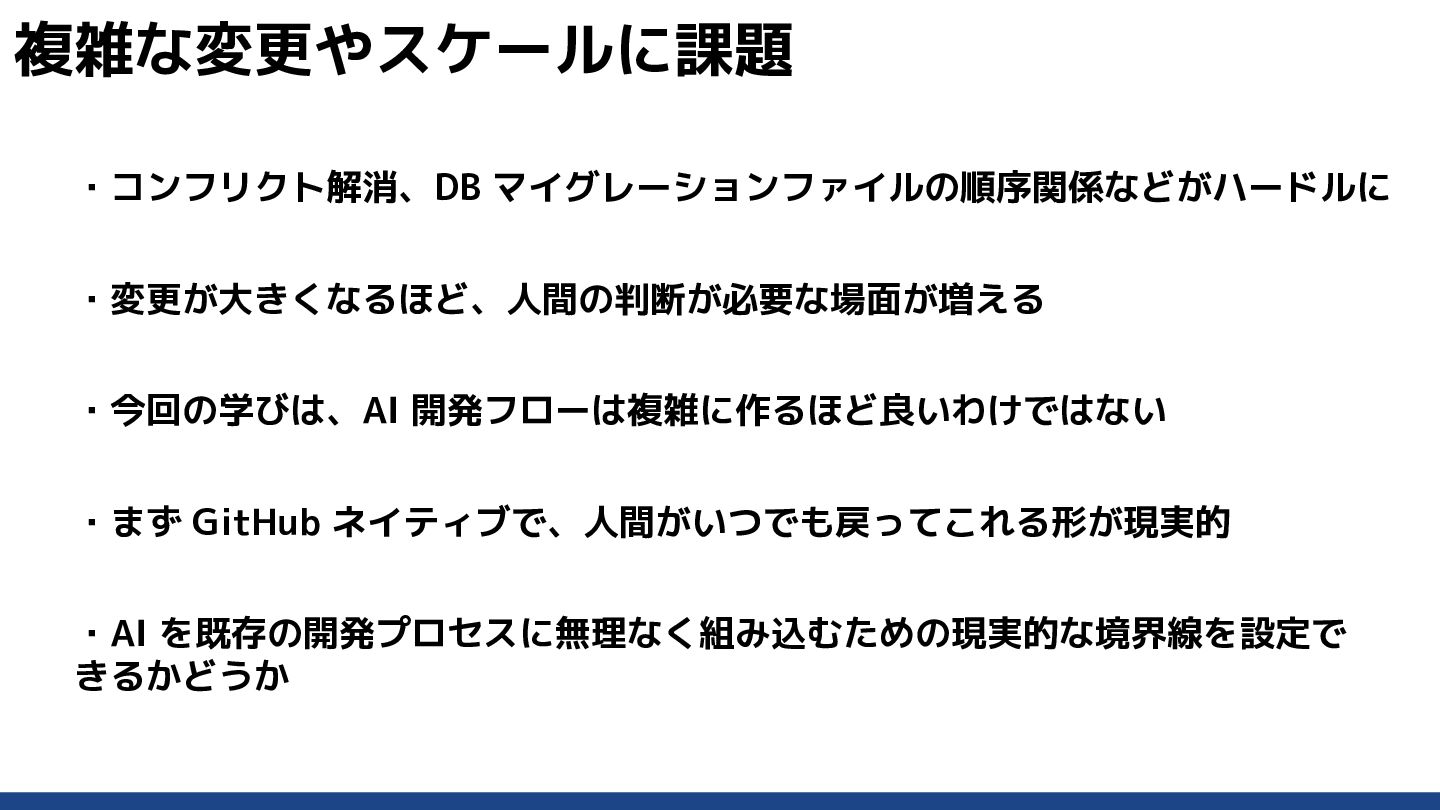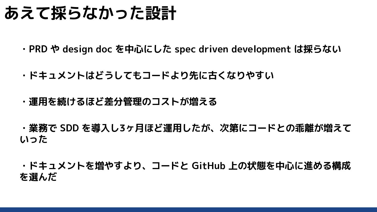 ・運用を続けるほど差分管理のコストが増える ・業務で SDD を導入し3ヶ月ほど運用したが、次第にコードとの乖離が増えて いった ・ドキュメントを増やすより、コードと GitHub 上の状態を中心に進める構成 を選んだ あえて採らなかった設計