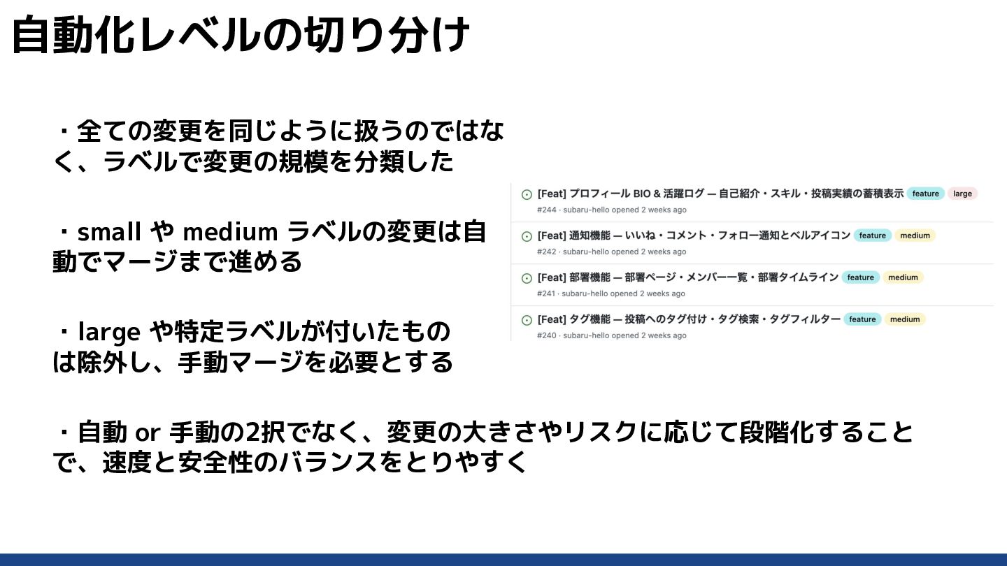 3. ・全ての変更を同じように扱うのではな く、ラベルで変更の規模を分類した ・small や medium ラベルの変更は自 動でマージまで進める ・large や特定ラベルが付いたもの は除外し、手動マージを必要とする